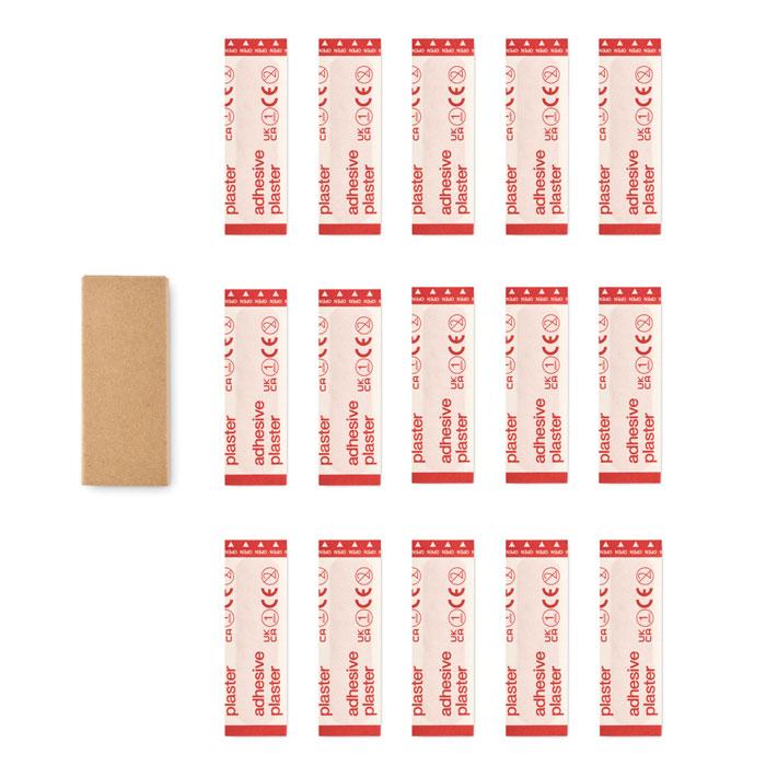 15 pièces de pansements adhésifs dans une boîte en papier recyclé. Non disponible à la vente en Suisse.