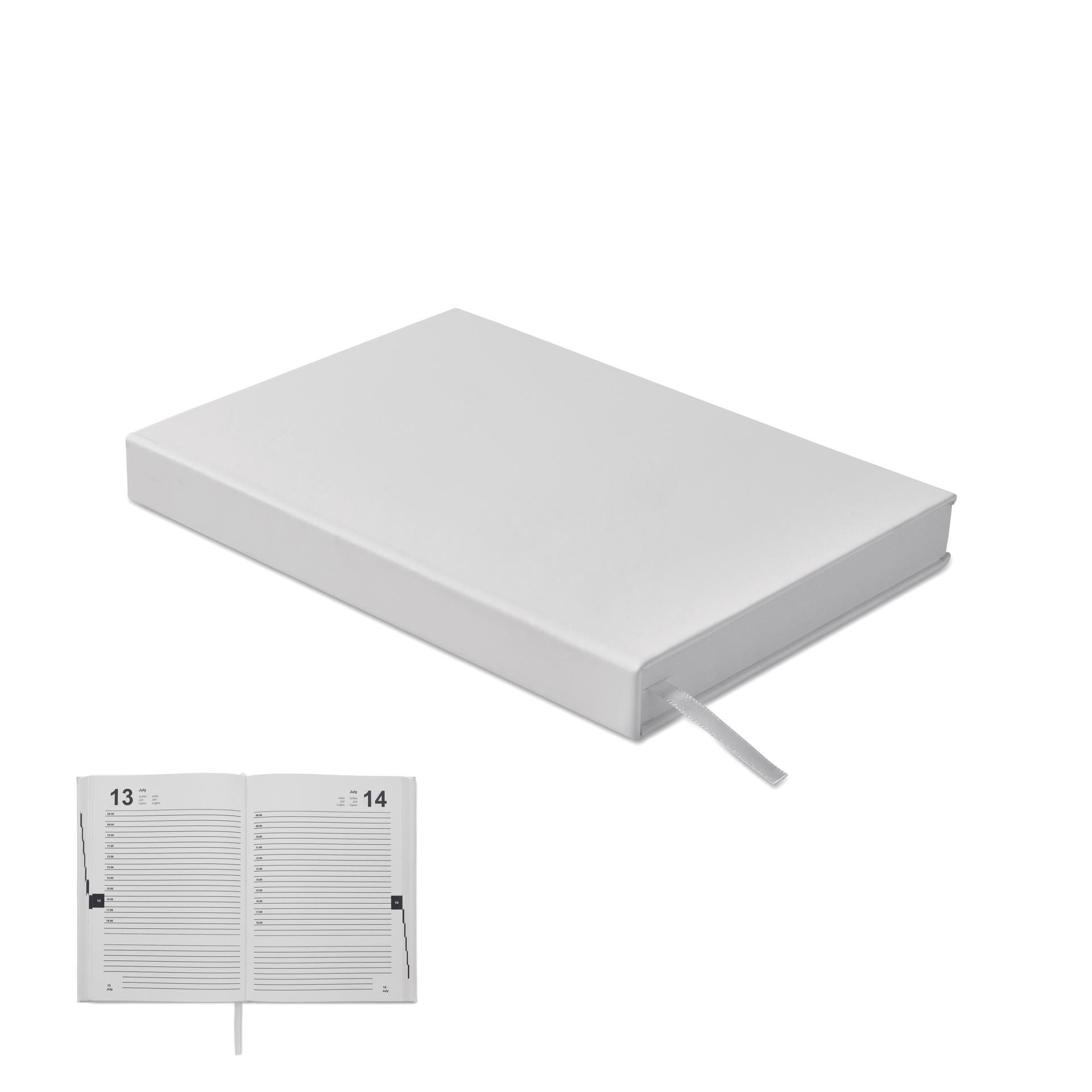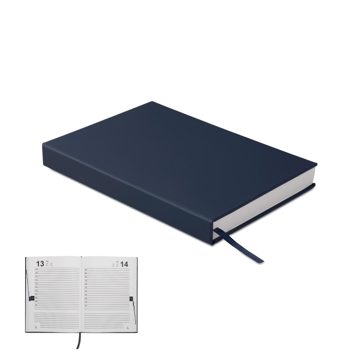 Agenda A5 perpétuel en polyester post-consommation recyclé à 60 % et couverture en PU à 40 %. 416 pages universelles en papier recyclé 70gsm (208 feuilles). Marque page en polyester de couleur assortie.