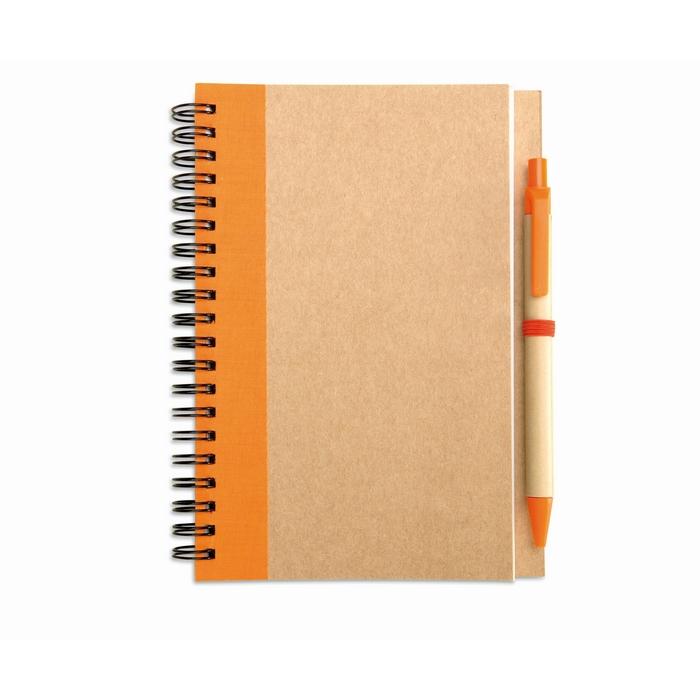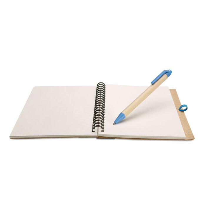Carnet à spirale en papier recyclé avec stylo assorti. 140 pages blanches en papier recyclé ordinaire (70 feuilles). Stylo à bille à bouton poussoir assorti en carton recyclé et plastique biodégradable. Encre bleue. Passant à stylo élastique assorti.
