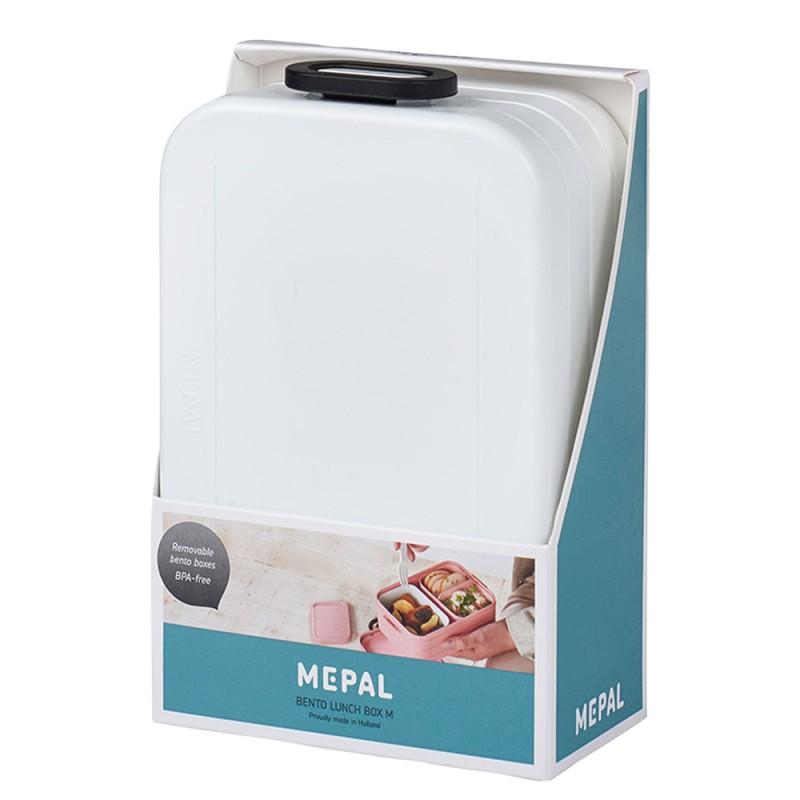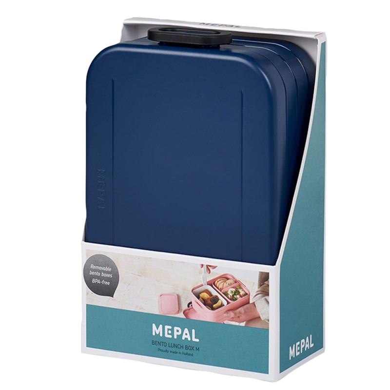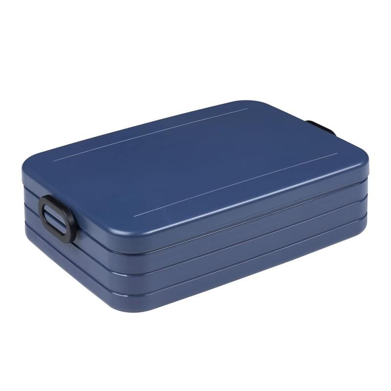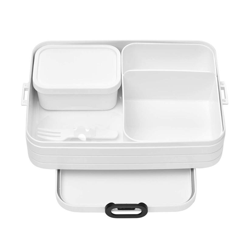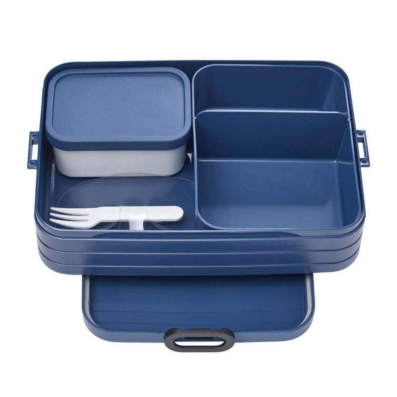 Grande boîte à déjeuner de 1.5L équipée d’une boîte bento avec deux compartiments et d’une autre boîte munie d'une petite fourchette. Matière : PP, ABS et TPE, 0% BPA. Fabriquée en Europe.