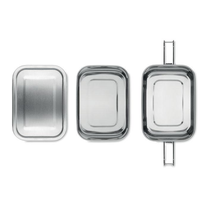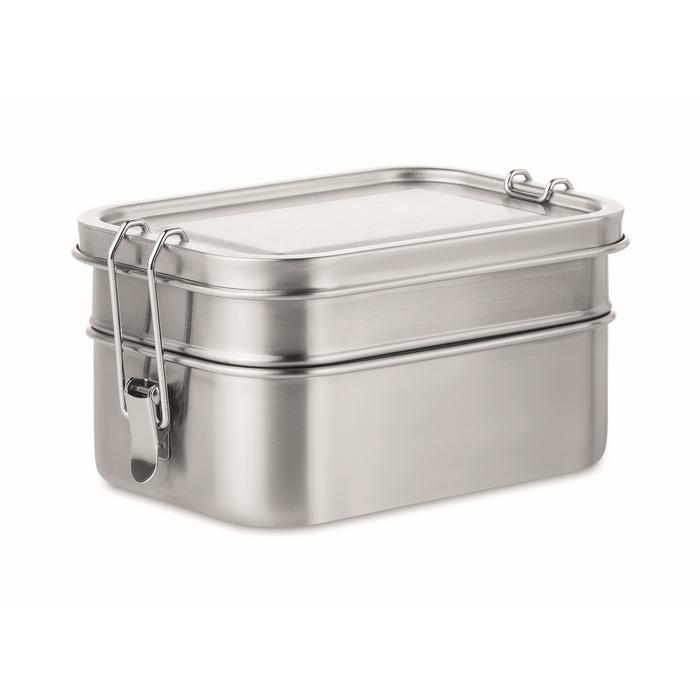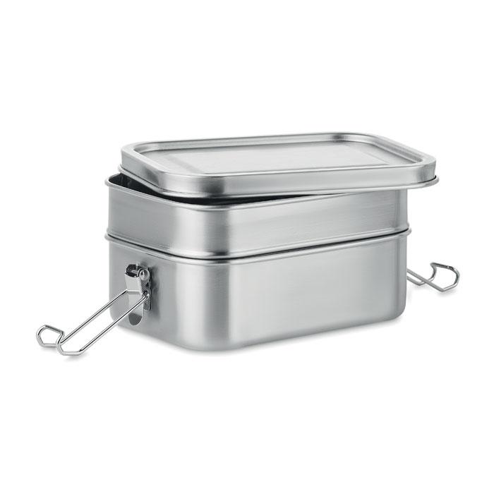 Lunch box en acier inoxydable 2 compartiments avec des fermetures latérales solides et sûres. Contenance 1200 ml.