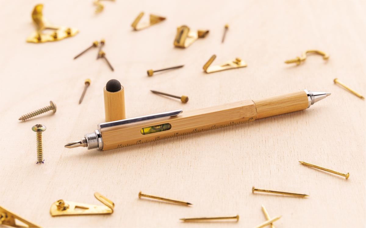 Stylo multifonction en bambou avec règle (7 cm), niveau à bulle, tournevis, pointe de stylet et stylo à bille avec encre bleue (jusqu'à 400 m) Fabriqué en bambou avec clip en aluminium.
