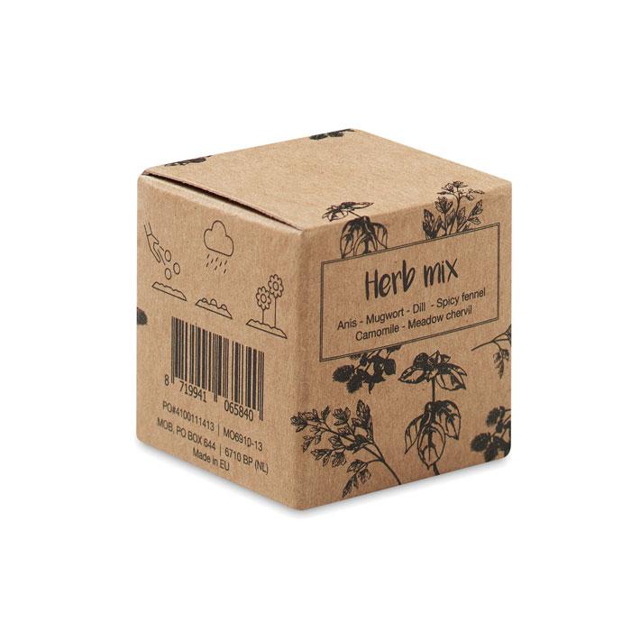 Kit de culture de graines en boule présenté dans une boîte en carton. Comprenant des graines d'anis, d'artemisia vulgaris, d'aneth, de fenouil, de camomille et de persil de vache. Fabriqué dans l'UE.