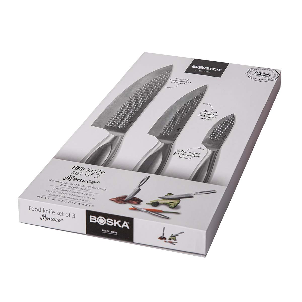 Le set de couteaux de cuisine Monaco+, de la marque BOSKA est le set ultime pour tous les amateurs de cuisine. Il présente les mêmes caractéristiques que les couteaux professionnels : acier inoxydable de haute qualité, tranchant exceptionnel et manche élancé pour un contrôle total du couteau. Couteau de cuisine - pour tout couper ! Couteau de sous-chef - parce qu'il n'y a pas de chef sans sous-chef. Couteau d'office - pour couper les légumes et les fruits. Cet ensemble se lave uniquement à la main et est garanti à vie.