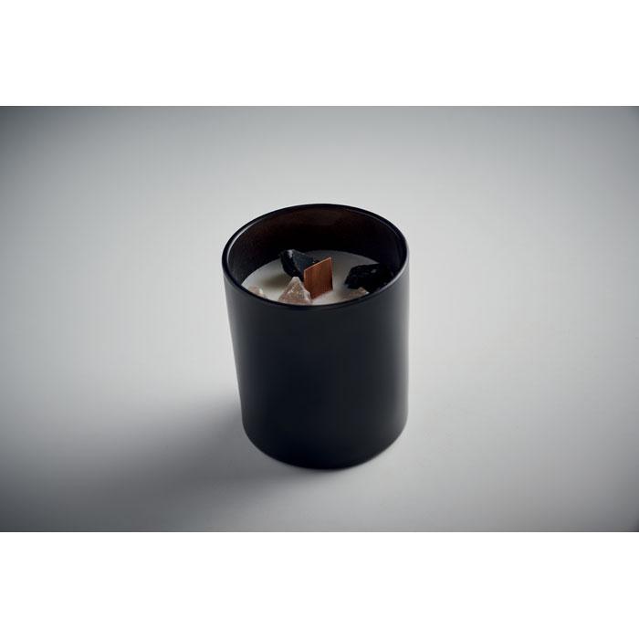 Bougie en cire végétale parfumée à la vanille en verre avec pierres et mèche en bois. 200 gr. Durée de combustion : 20 heures.