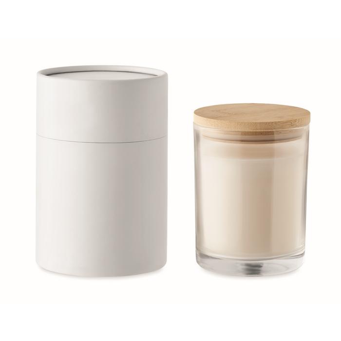 Bougie de cire parfumée à la vanille en verre avec couvercle en bambou dans une boîte cadeau en papier. 8cm diamètre. Le bambou est un produit naturel, et présente de légères variations de couleur, de décoration et de tailles.