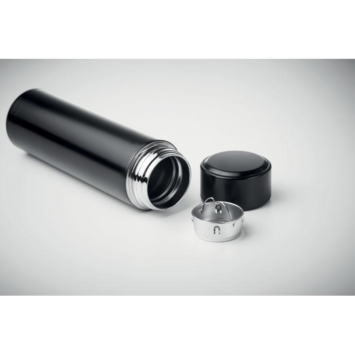 Bouteille à vide isolant en acier inoxydable à double paroi. Comprenant un thermomètre à LED tactile sur le couvercle et un infuseur à thé à l'intérieur. 1 pile CR2032. Étanche. Capacité 450 ml. Anti fuite.