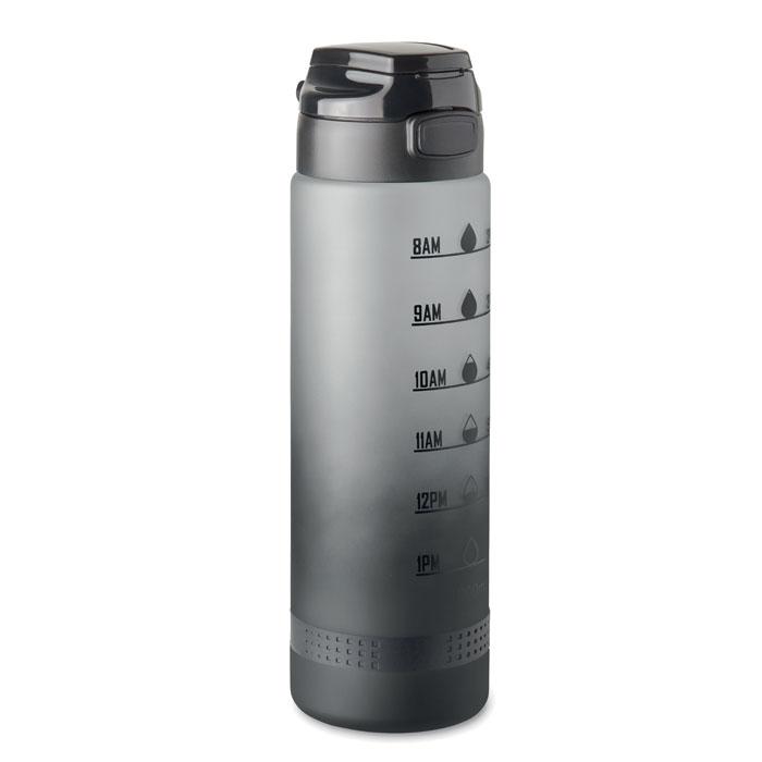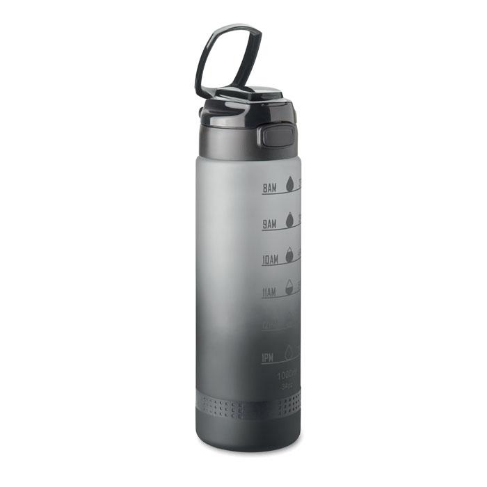 Bouteille de sport en RPET, graduation temps/contenance, couvercle rabattable à ouverture d’une seule main, verrou de sécurité et poignée. Anti fuite. Contenance : 1L.