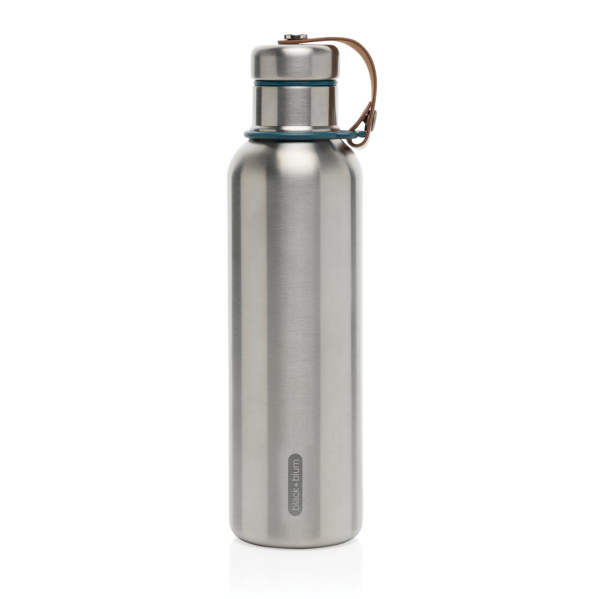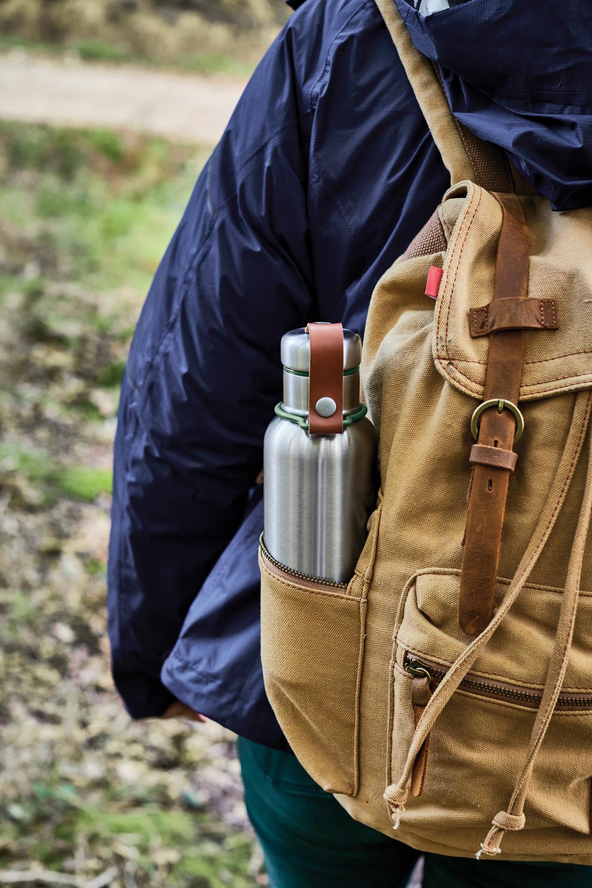Bouteille d'eau isotherme en acier inoxydable, élégante bouteille sous vide qui garde les boissons froides pendant 24 heures ou chaudes pendant 12 heures. Le couvercle est également en acier inoxydable, ce qui signifie que l'eau n'entre pas en contact avec du plastique. Le cuir artificiel sert de dragonne de transport et constitue un joli détail esthétique. Lavage à la main uniquement.