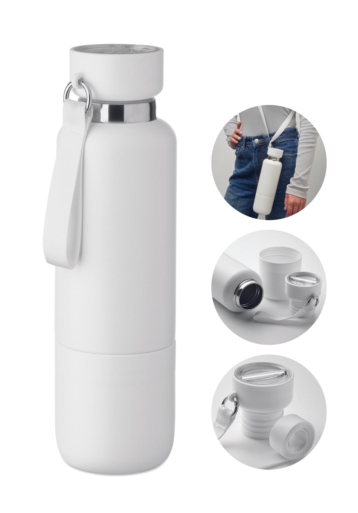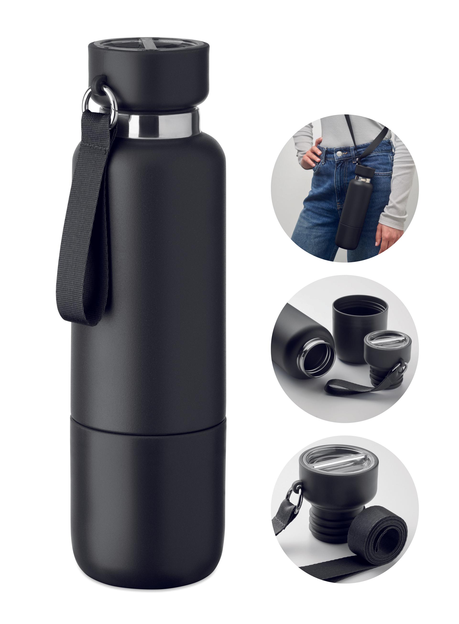 Bouteille isotherme à double paroi en acier inoxydable recyclé (90 %) et en acier inoxydable (10 %), avec poignée intégrée et longue sangle supplémentaire (70 cm) dans le couvercle en PP. Anti fuite. Gobelet inclus. Capacité 500 ml.