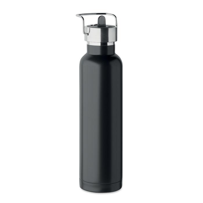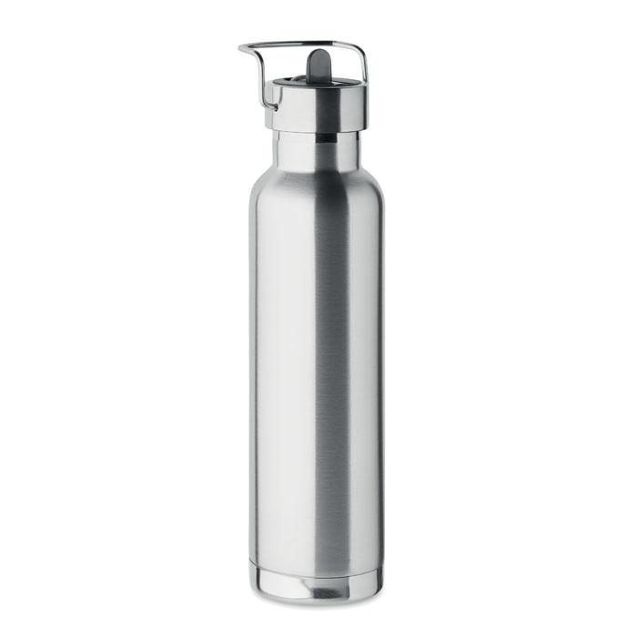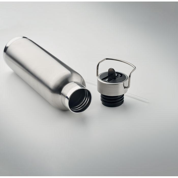 Bouteille isolante sous vide à double paroi en acier inoxydable recyclé (90 % d'acier inoxydable recyclé et 10 % d'acier inoxydable) avec paille intégrée et poignée de fermeture. Anti fuite. Capacité : 660 ml.