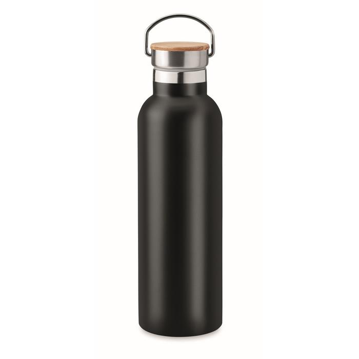 Bouteille à vide isolant à double paroi en acier inoxydable avec couvercle en bambou et poignée de transport. Capacité : 750 ml. Anti fuite. Le bambou est un produit naturel, et présente de légères variations de couleur, de décoration et de tailles.