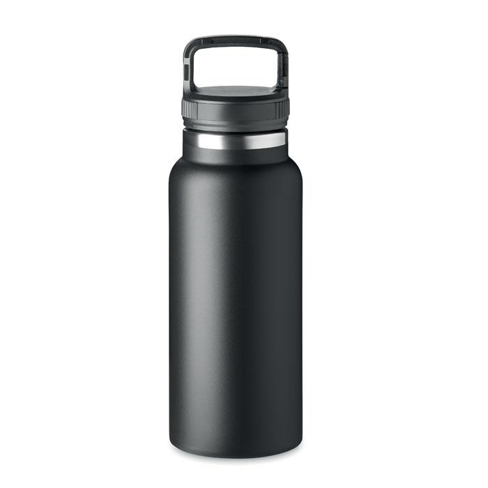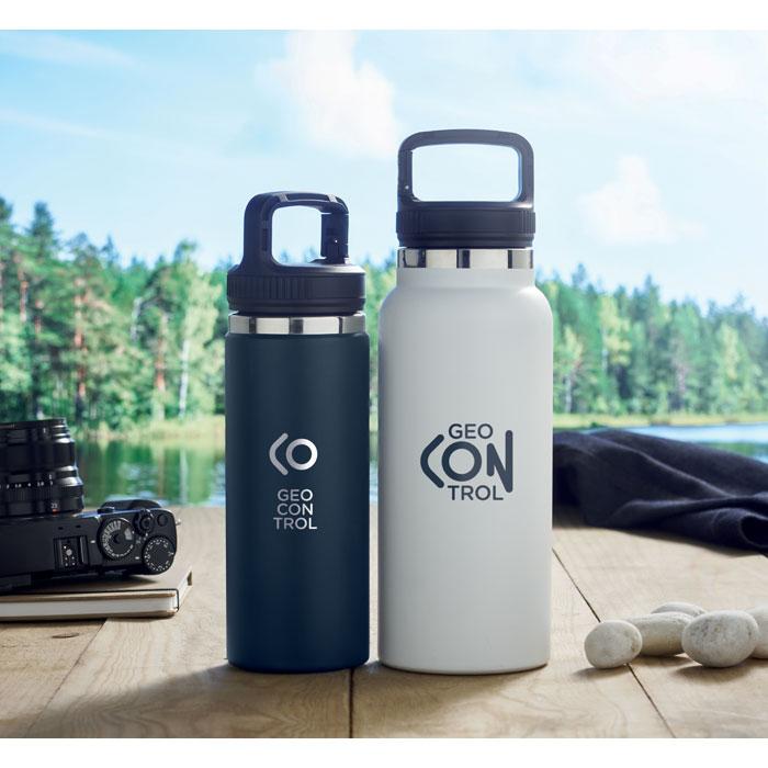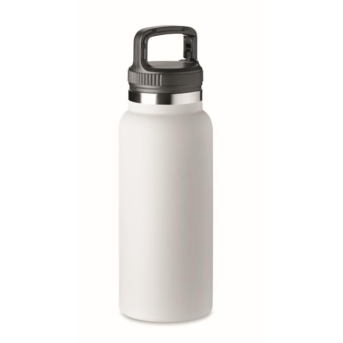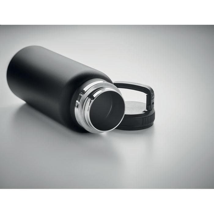 Bouteille à vide isolant en acier inoxydable à double paroi avec crochet de suspension sur le couvercle. Capacité : 970 ml.