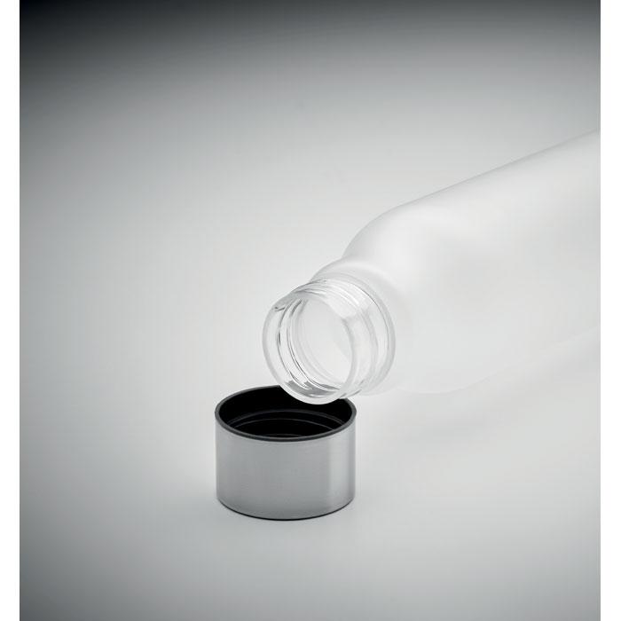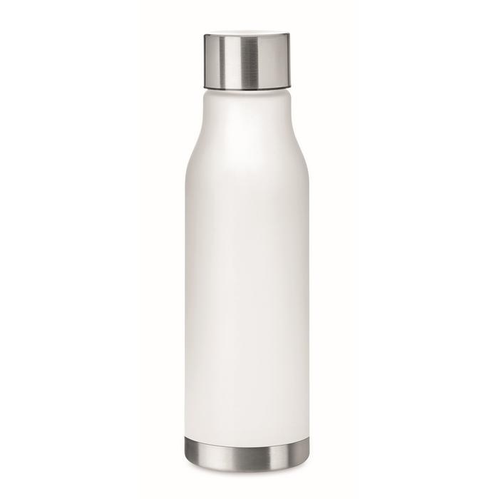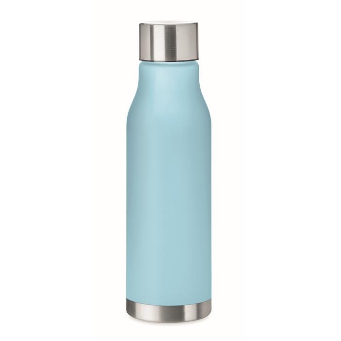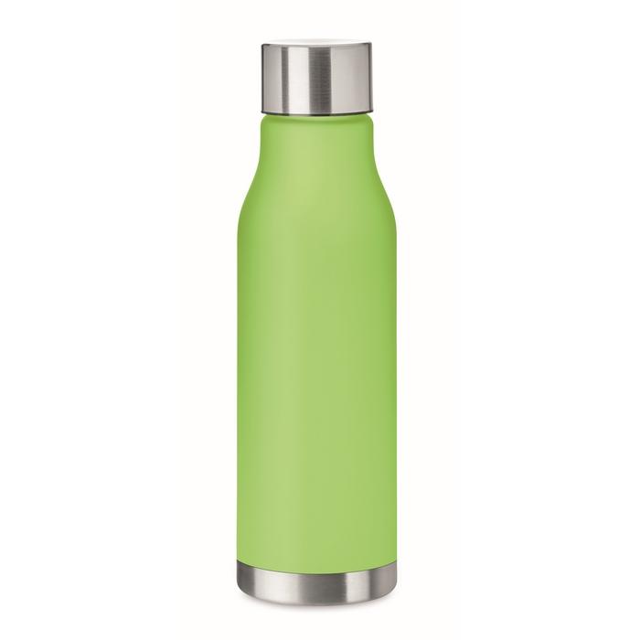 Bouteille en RPET avec finition caoutchoutée et acier inoxydable. Bouchon intérieur en RPET et anneau en silicone. Sans BPA. Anti fuite. Contenance : 600 ml. Ne convient pas aux boissons gazeuses.
