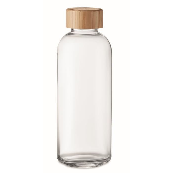 Bouteille en verre avec couvercle en bambou. Capacité 650 ml. Anti fuite. Le bambou est un produit naturel, et présente de légères variations de couleur, de décoration et de tailles.