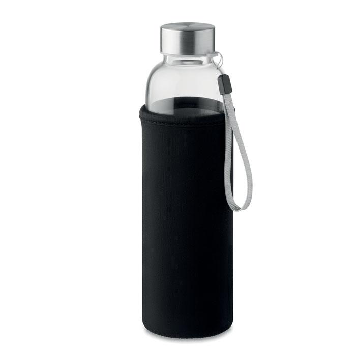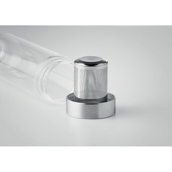 Bouteille en verre à haute teneur en borosilicate avec infuseur de thé et pochette en néoprène. Contenance: 500 ml. Ne convient pas aux boissons gazeuses. Anti fuite. La gravure au laser n'est pas possible sur le verre borosilicate.