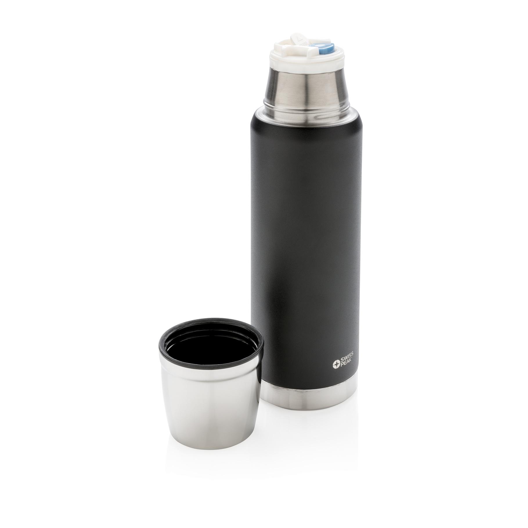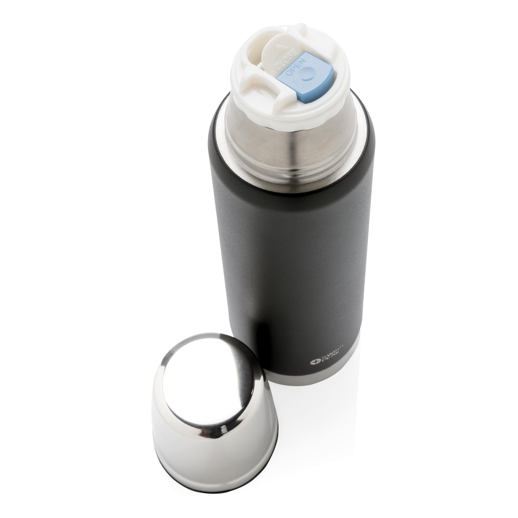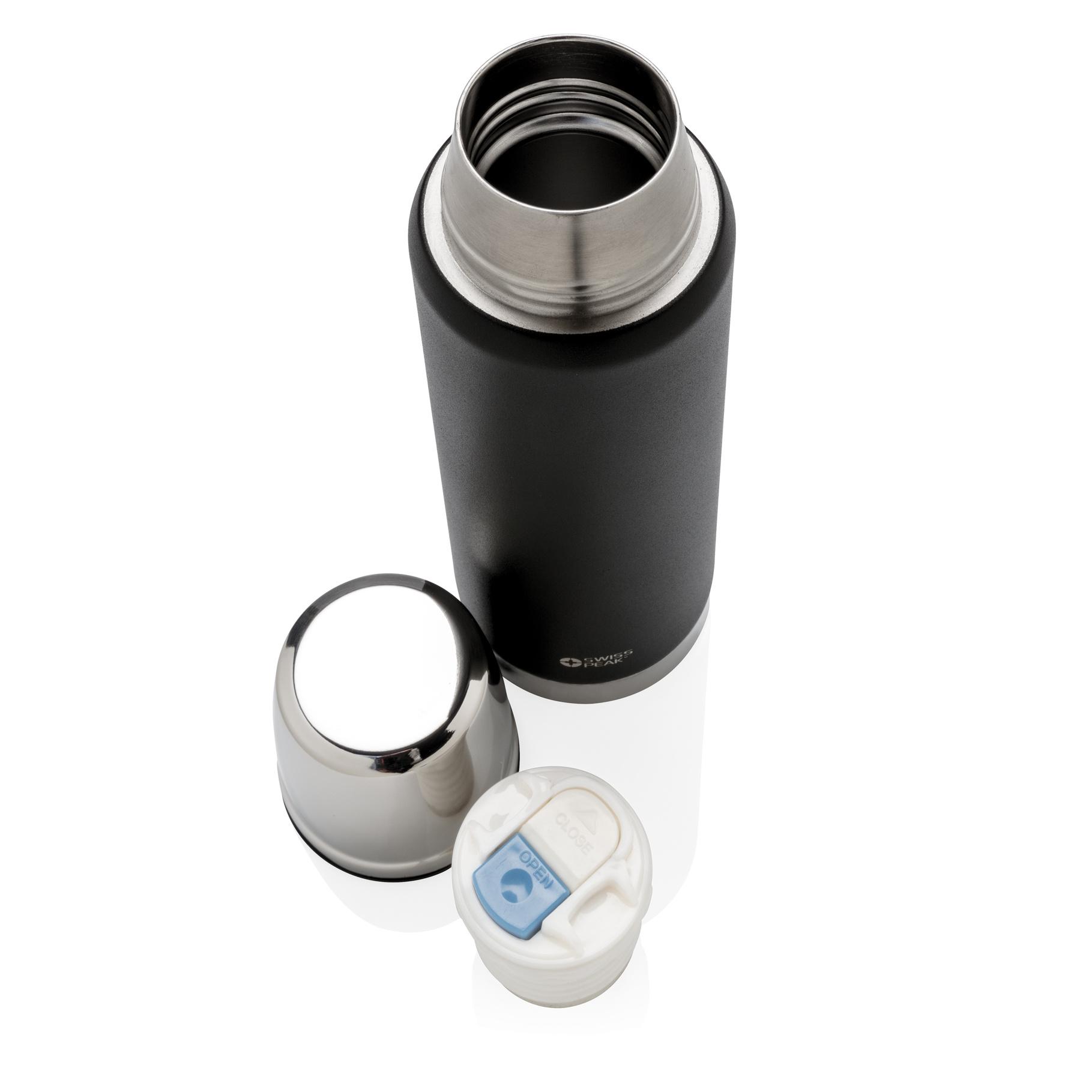 Bouteille isotherme 500ml à double paroi en acier inoxydable 18/8. La finition noire par poudrage électrostatique est faite pour durer, pas de décoloration ou craquelure possible! La paroi intérieure est couverte de cuivre pour une conductivité maximum qui permet de garder les boissons chaudes pour 8h et froides pour 24h. Lavage à la main uniquement.