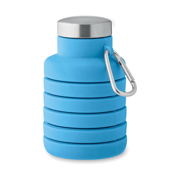 Bouteille en silicone pliable avec couvercle en acier inoxydable et mousqueton en aluminium. Le mousqueton n'est pas destiné à l'escalade (usage non professionnel). Capacité : 500 ml.