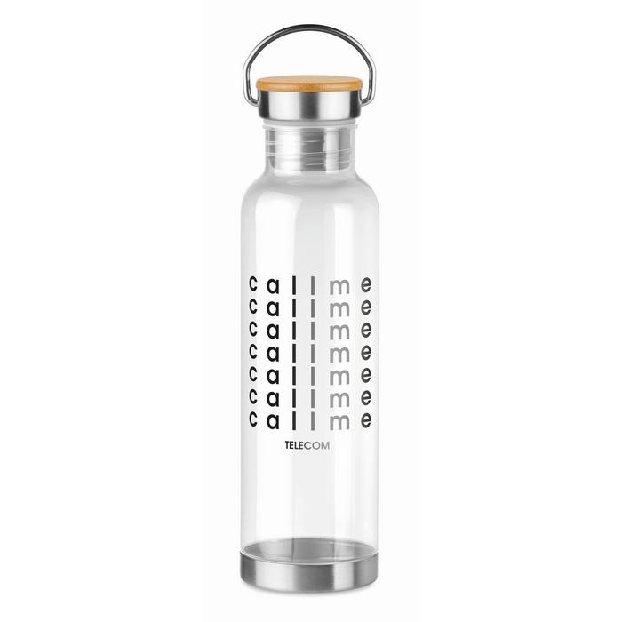 Bouteille Tritan™ sans BPA 800 ml avec fond en acier inoxydable et couvercle avec détail en bambou. Le bambou est un produit naturel, et présente de légères variations de couleur, de décoration et de tailles. Ne convient pas aux boissons gazeuses. Anti fuite.