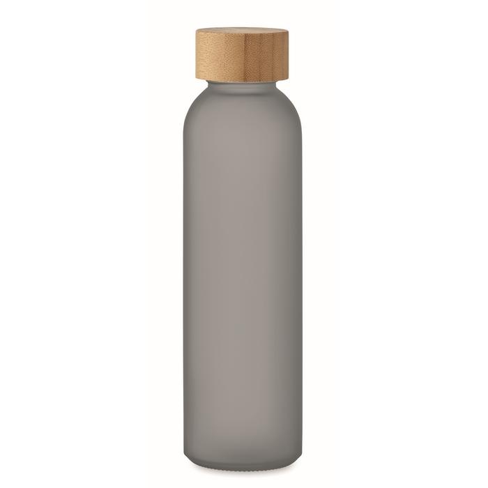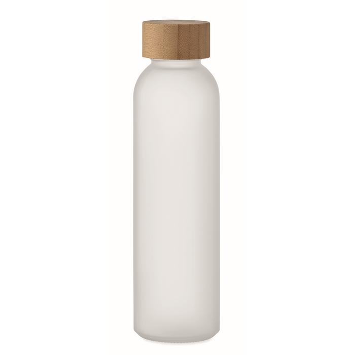 Bouteille en verre avec finition givrée et couvercle en bambou. Anti fuite. Capacité : 500 ml. Le bambou est un produit naturel, et présente de légères variations de couleur, de décoration et de tailles.