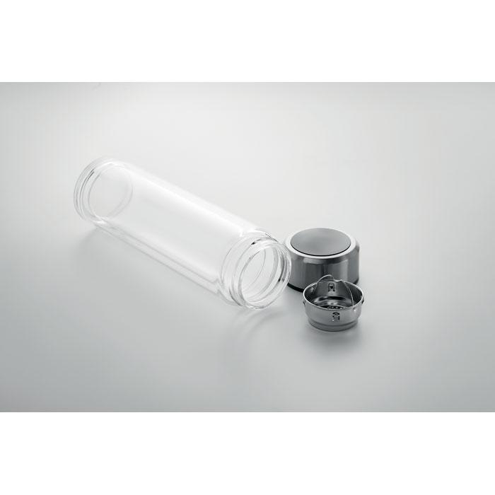 Bouteille à double paroi en verre borosilicaté. Equipée d'un thermomètre à LED dans le haut du couvercle et d'un infuseur à thé à l'intérieur. 1 pile CR2032 incluse. Anti fuite. Contenance : 390 ml.