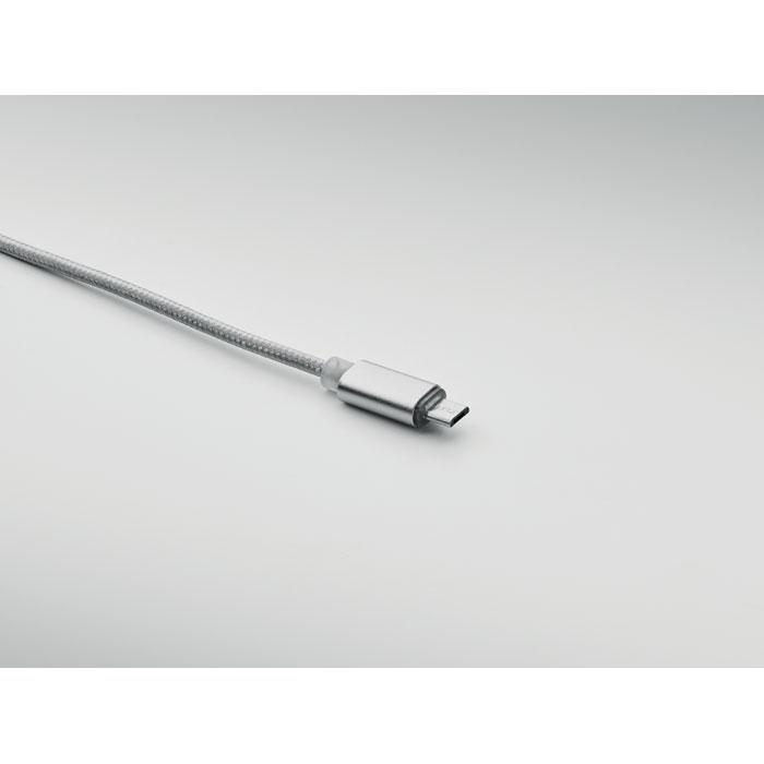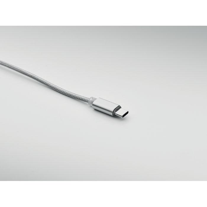 Câble de recharge en aluminium avec entrée : 2-en-1 type-C & type-A et micro-B (2 en 1 pin), sortie type C et micro B. Longueur du câble : 120 cm.
