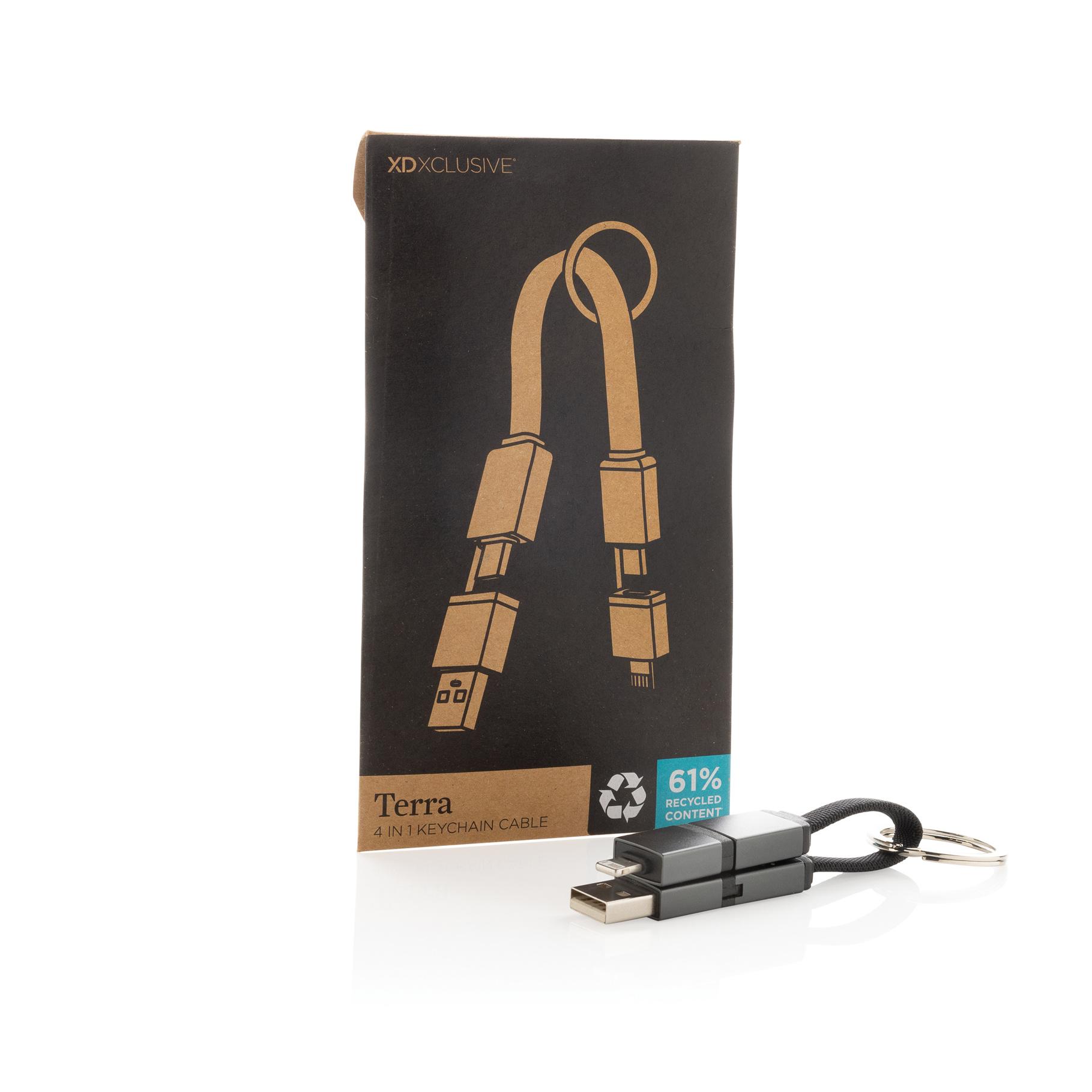 Câble porte-clés 4 en 1 à charge rapide, fabriqué en TPE recyclé RCS, en alliage d'aluminium recyclé et en PET recyclé. Avec une entrée USB A et type C et une sortie IOS et type C, parfait pour charger de nombreux types d'objets. Ce câble de petite taille permet une charge rapide de 60W. Facile à attacher à votre trousseau de clés grâce à l'anneau inclus. Les connecteurs sont dotés d'aimants à l'intérieur pour les maintenir ensemble lorsqu'ils sont transportés. Contenu recyclé total : 60 % sur la base du poids total de l'article. La certification RCS garantit une chaîne d'approvisionnement entièrement certifiée pour les matériaux recyclés. Courant maximum supporté 20V/3A ; Emballé dans une enveloppe sans plastique. Sans PVC.