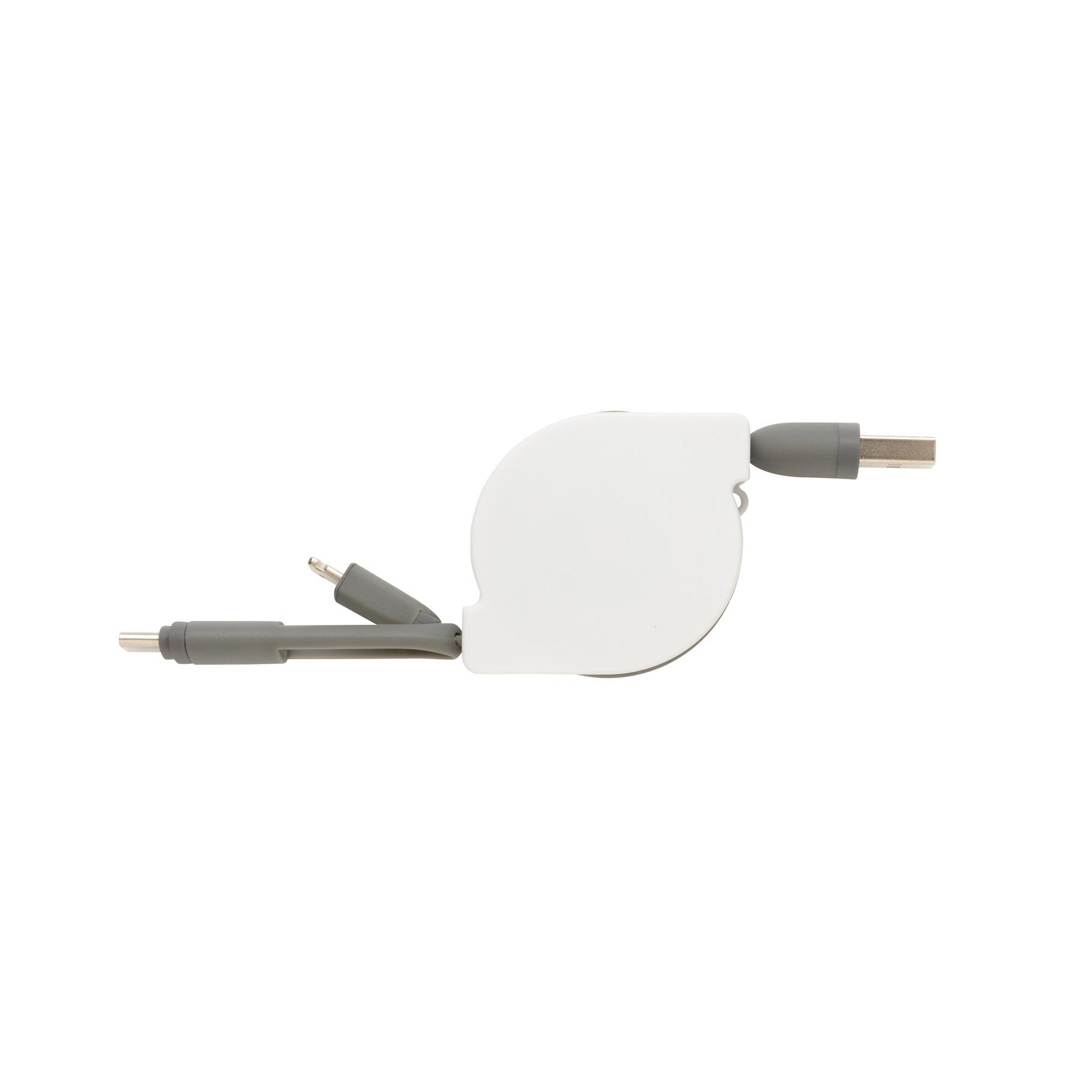 Câble de charge compact et rétractable 3 en 1 avec type C et connexion double pour IOS et Android qui nécessitent le micro USB. Grace à son mécanisme rétractable, le câble plat de 100cm peut facilement être emmené n'importe où sans s'emmêler. Boitier en ABS avec câble en TPU. Synchronisation possible.