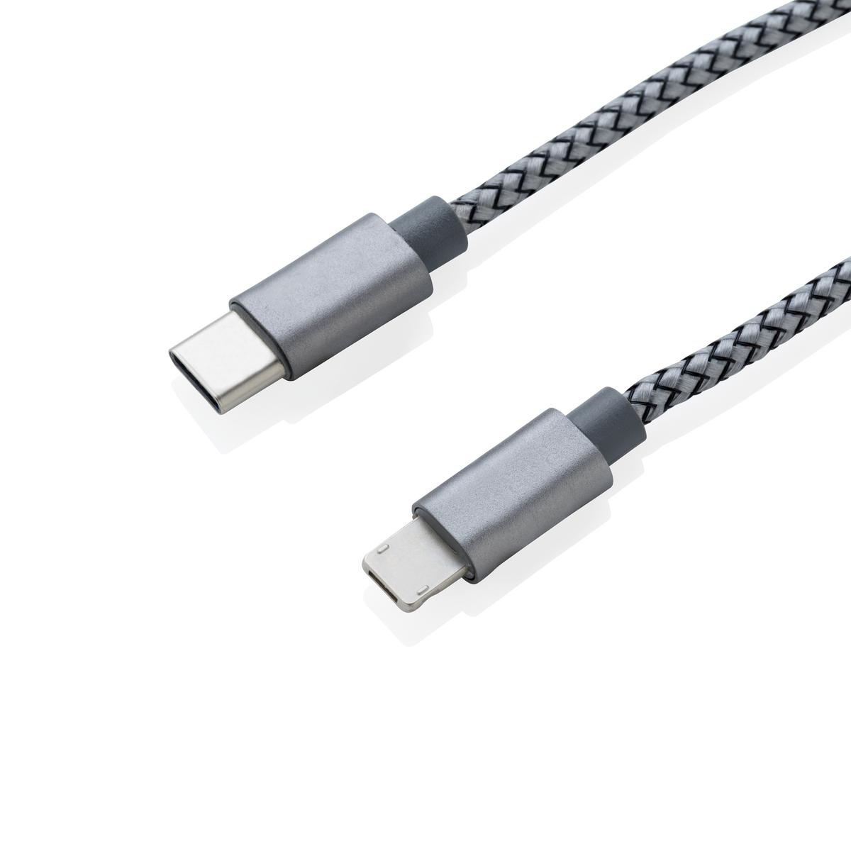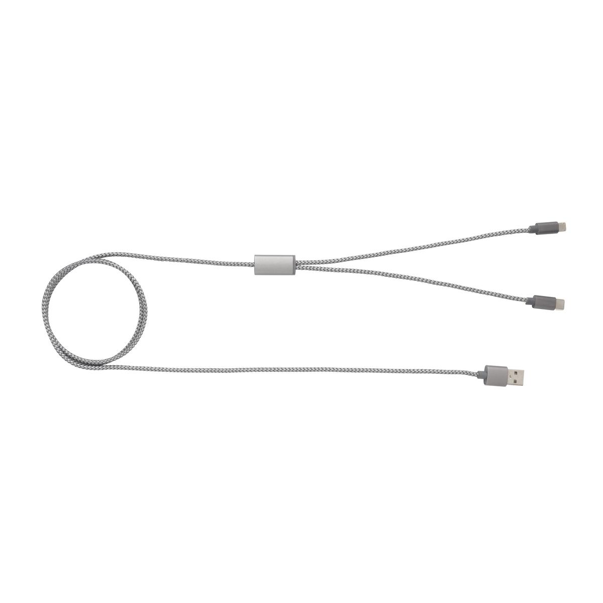 Câble tressé 3 en 1 avec type C et connecteur double pour les appareils iOS et Android qui nécessitent un micro USB. Câble tressé de 120cm en nylon avec connecteurs en aluminium, uniquement pour la charge.