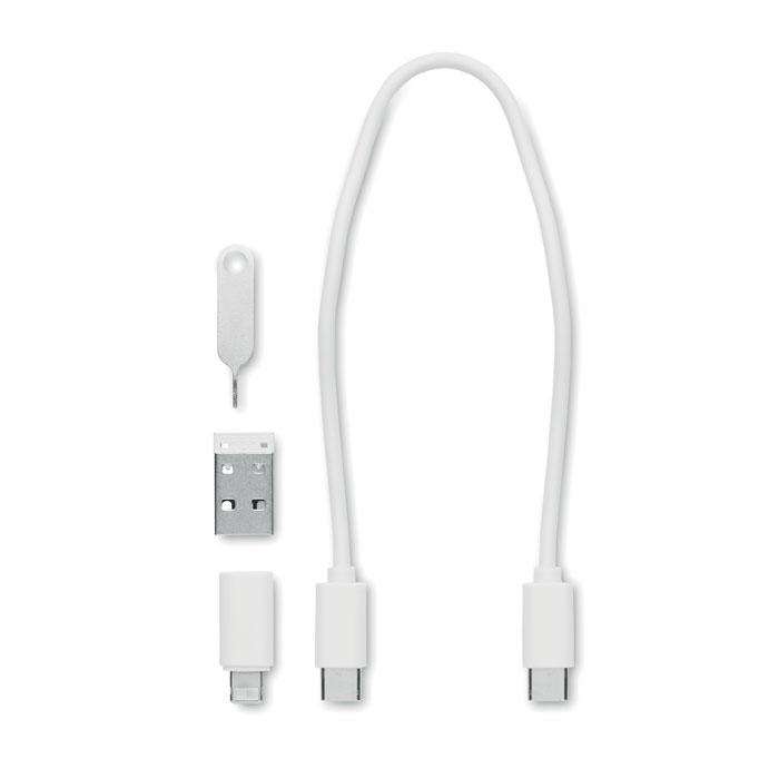 Ensemble de câbles et de connecteurs 9 en 1. Câble de transfert de données et de charge (480 Mbps) : Type-C à Type-C. Adaptateurs : Type-C vers Type-A et Type-C vers 2-en-1 Lightning & micro-B. Fentes de stockage Micro et Nano SIM. Outil d'éjection.