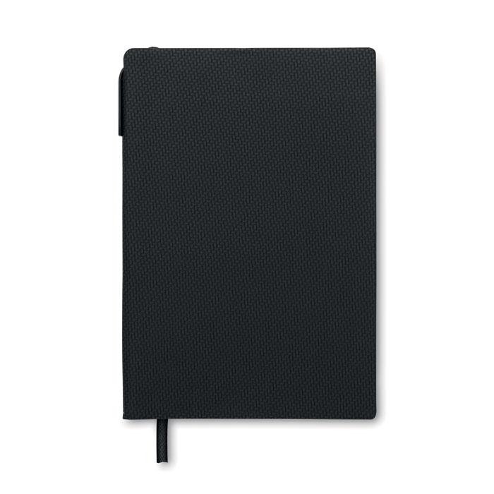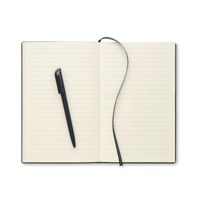 Carnet A5 avec couverture structurée en PU et stylo-bille ABS twist à l'intérieur du porte-stylo du dos. 160 pages lignées en papier recyclé (80 feuilles).