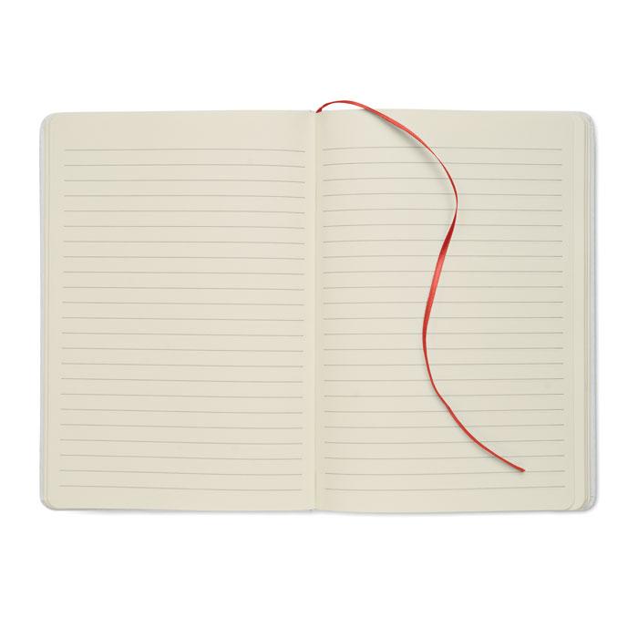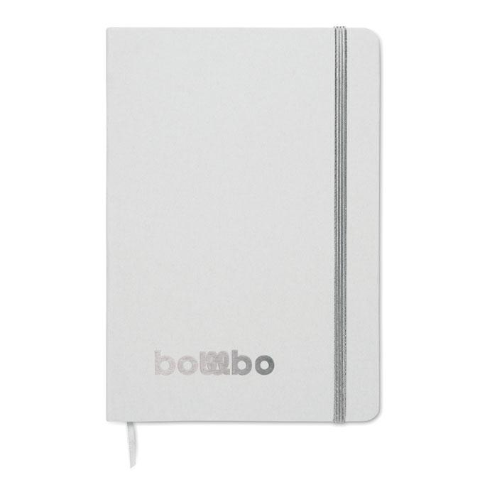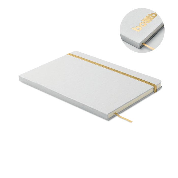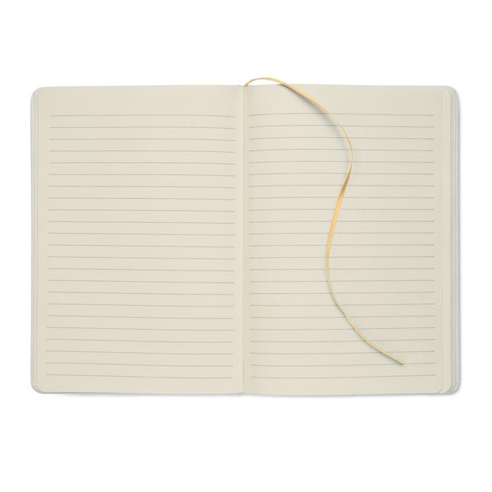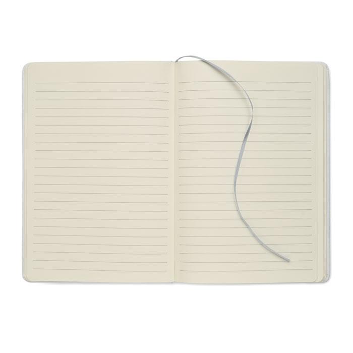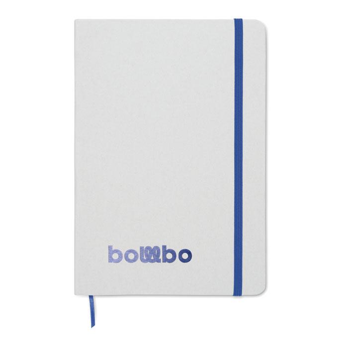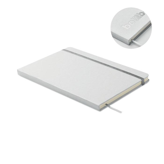 Carnet A5 à couverture rigide composé de 70% de briques de lait recyclées et de 30% de papier recyclé. Couverture blanche. 160 pages lignées en papier recyclé (80 feuilles). Fermeture élastique, marque-page assorti à la couleur du carnet. La couleur est révélée après la gravure au laser.