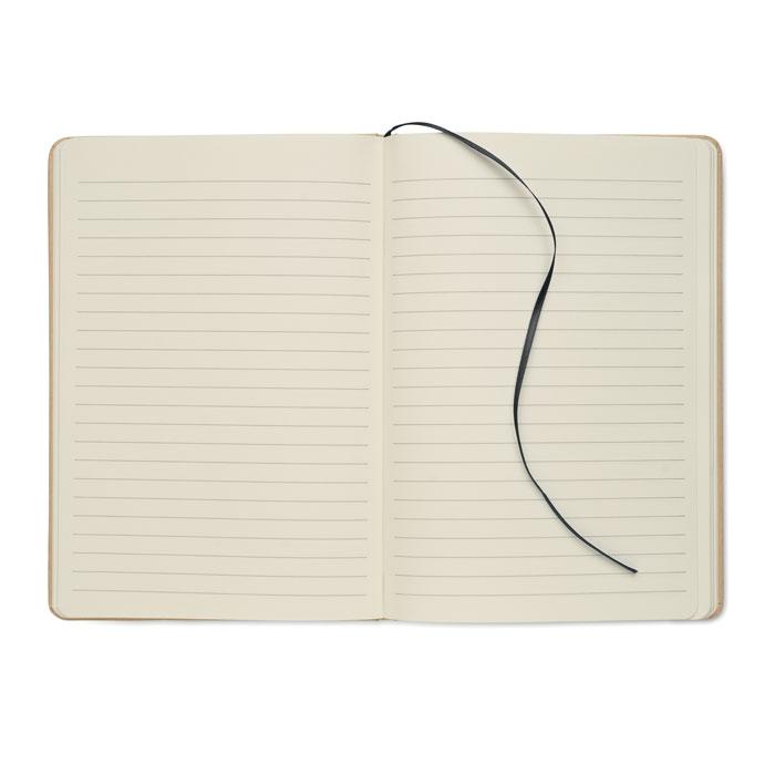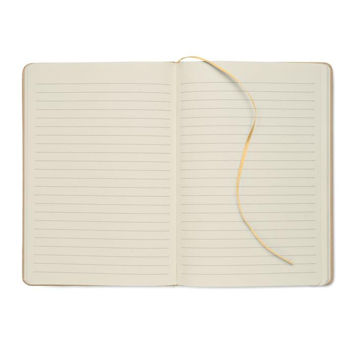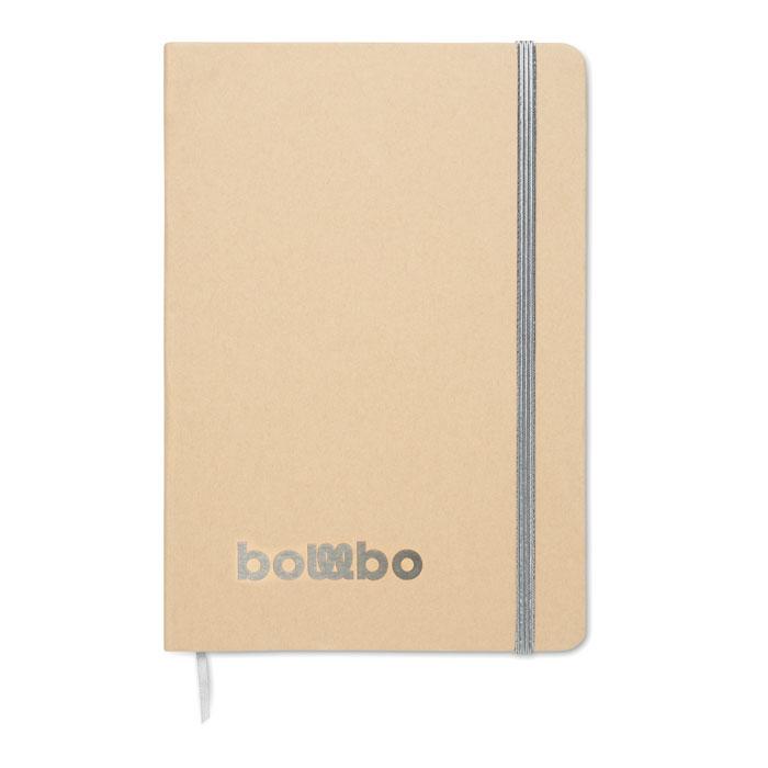 Carnet A5 avec couverture rigide en carton recyclé. Couverture beige. 160 pages lignées en papier recyclé (80 feuilles). Fermeture élastique, marque-page assorti à la couleur révélée. La couleur est révélée après la gravure au laser.