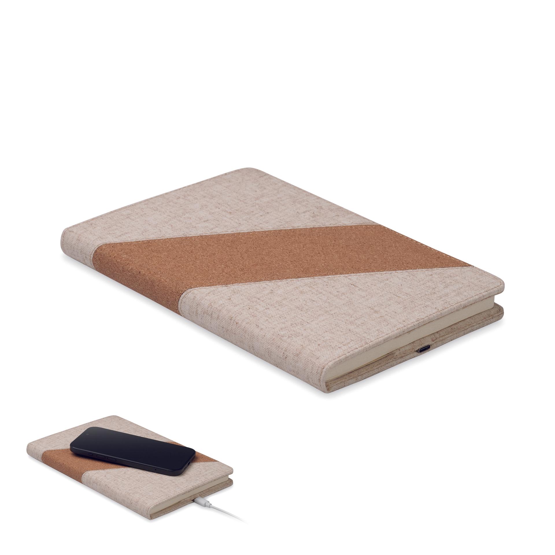 Carnet 2 en 1. Carnet A5 avec chargeur sans fil intégré 15W. Détails en coton et en liège sur la couverture, 128 feuilles lignées (64 feuilles). Ruban marque-page.