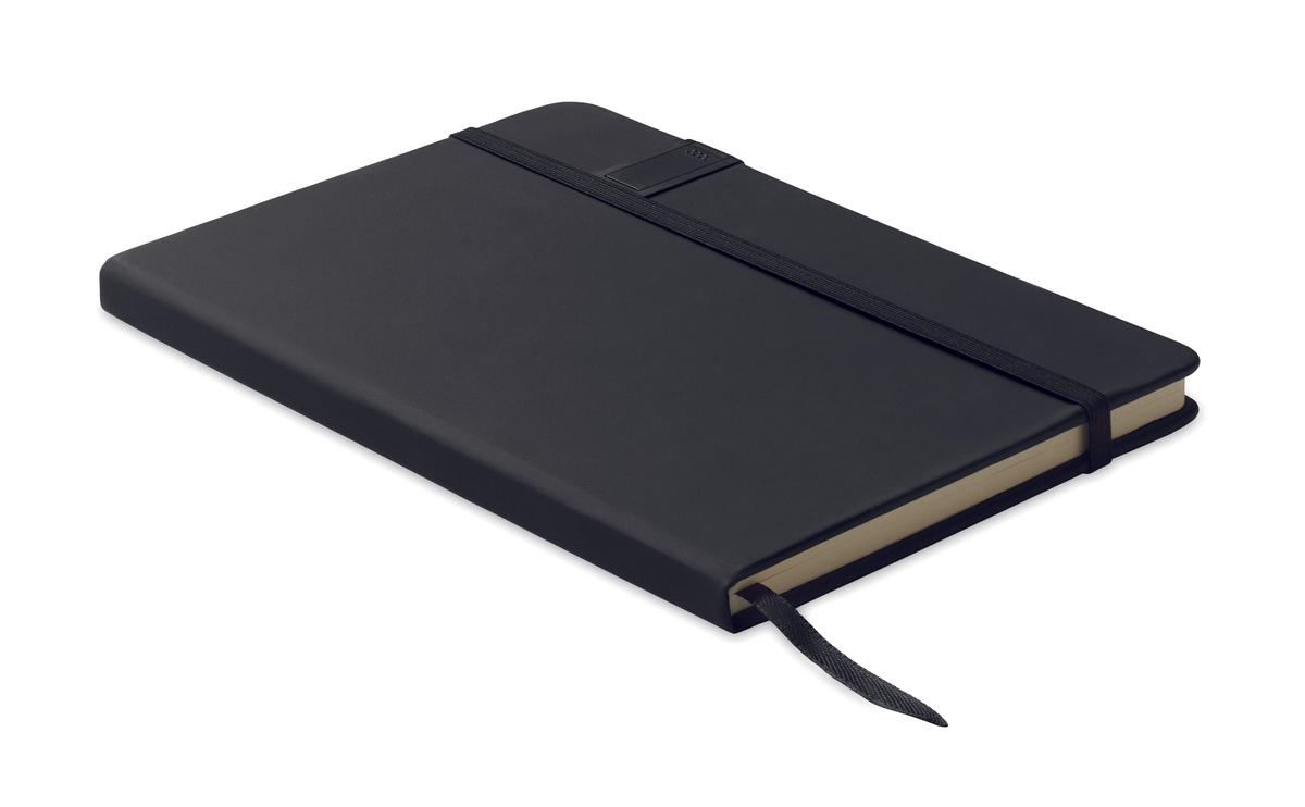 Carnet A5 couverture rigide en polyester recyclé (58 %) et PU (42 %) comprenant une clé USB 16 Go. Reliure dos collé. 160 pages lignées en papier recyclé (80 feuilles). Elastique e...