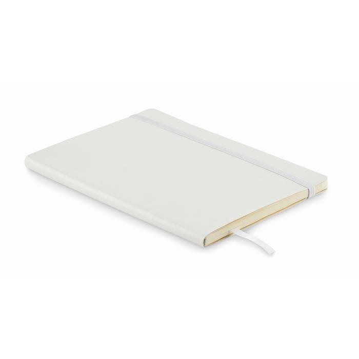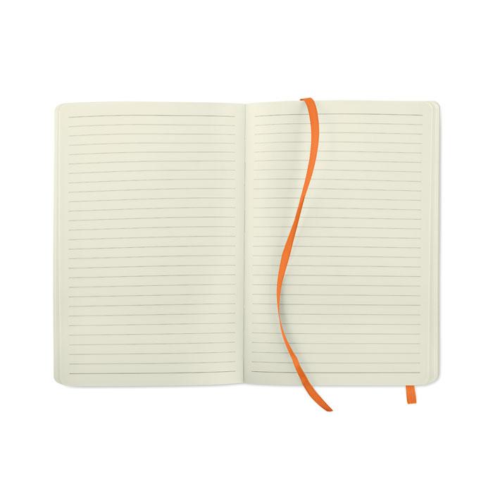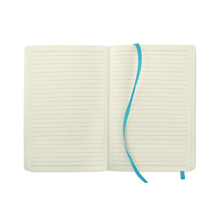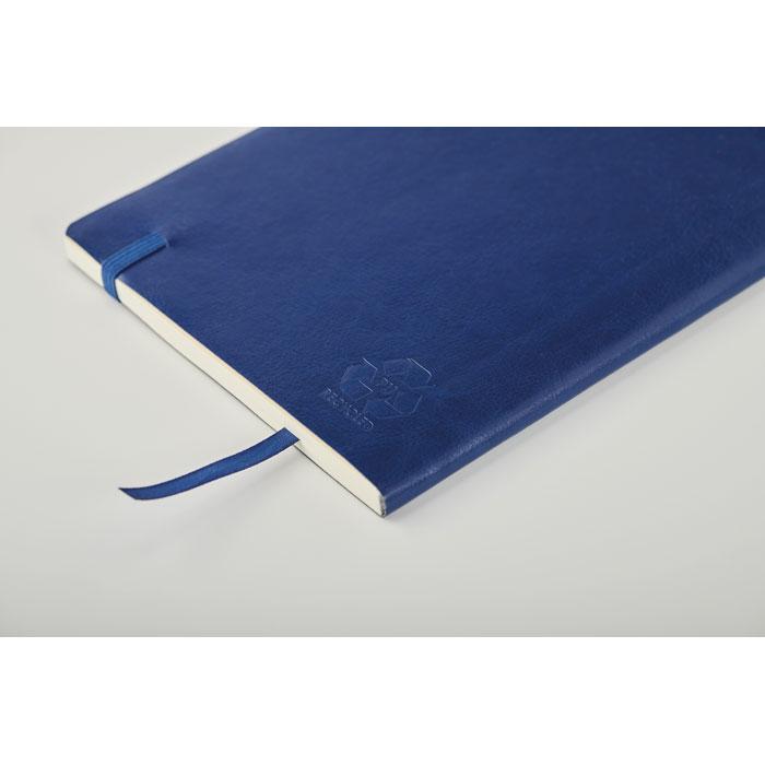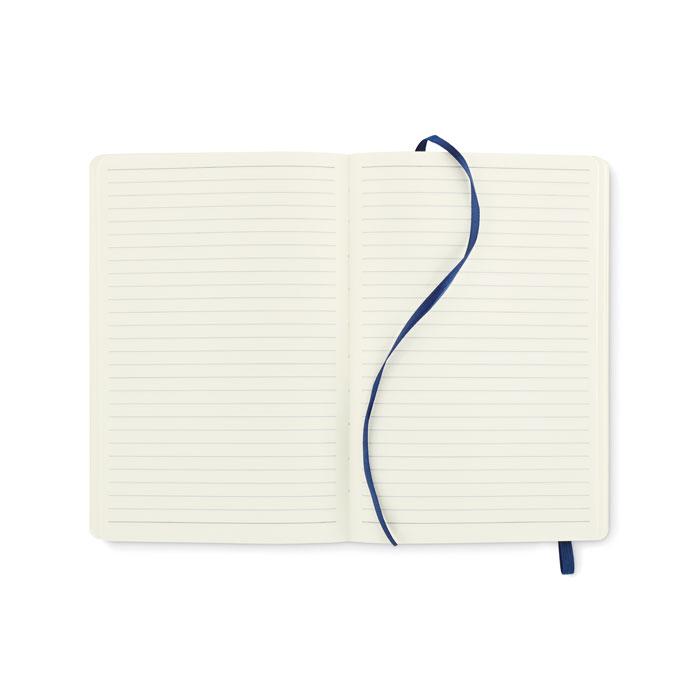 Carnet A5 avec couverture souple en PU recyclé (81 % polyester recyclé et 19% PU). 160 pages lignées (80 feuilles). Fermeture élastique et signet en ruban assortis. Pochette porte document au dos.
