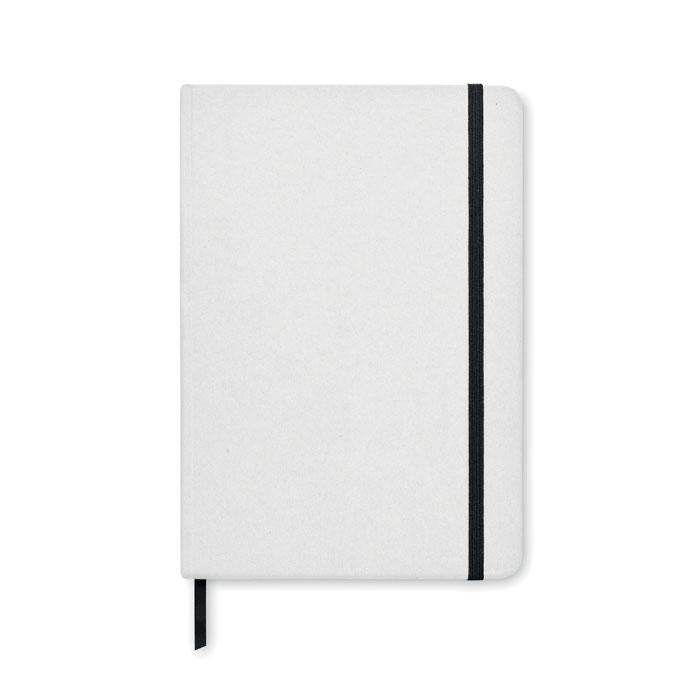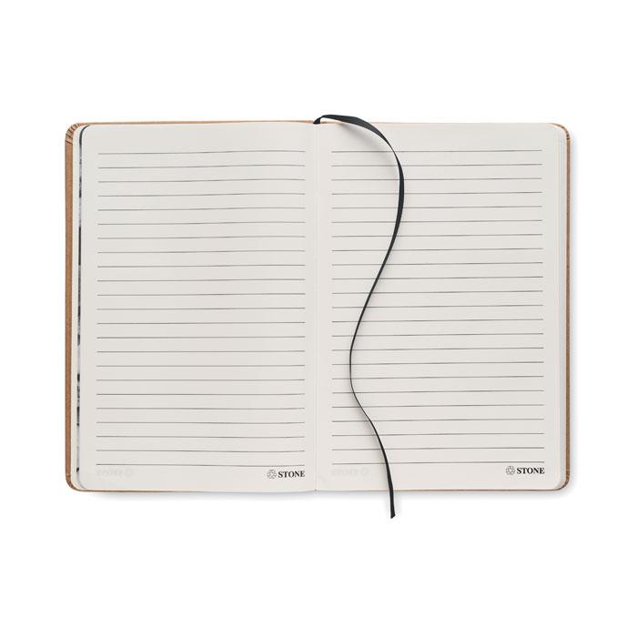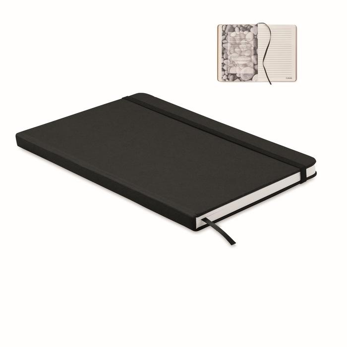 Carnet A5 avec couverture en carton rigide recyclé. 160 pages lignées en papier de pierre (80 feuilles). Bande de fermeture élastique et ruban marque-page.