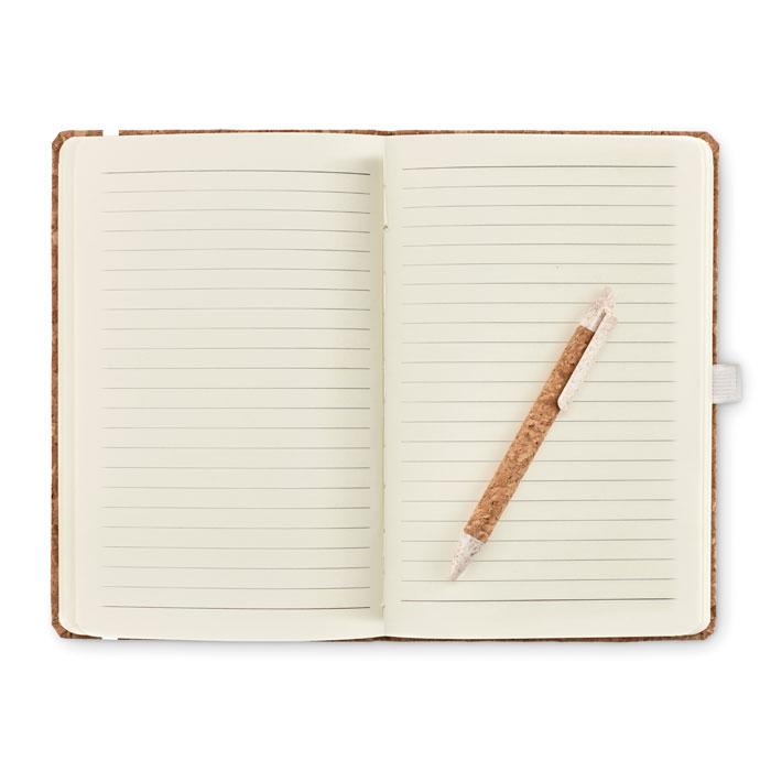 Carnet de notes en liège A5 avec stylo assorti. Couverture en liège rigide. 160 pages lignées (80 feuilles). Bande élastique de fermeture et porte-stylo. Stylo à bille à bouton-poussoir assorti avec corps en liège et détails 50% paille de blé et 50% PP. Présenté dans une boîte cadeau. Le liège est un matériau 100% naturel. En raison de sa nature structurelle et de la porosité de sa surface, le résultat final de l'impression par article peut présenter des déviations.