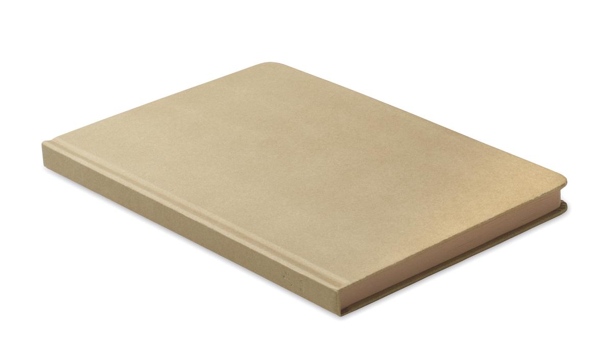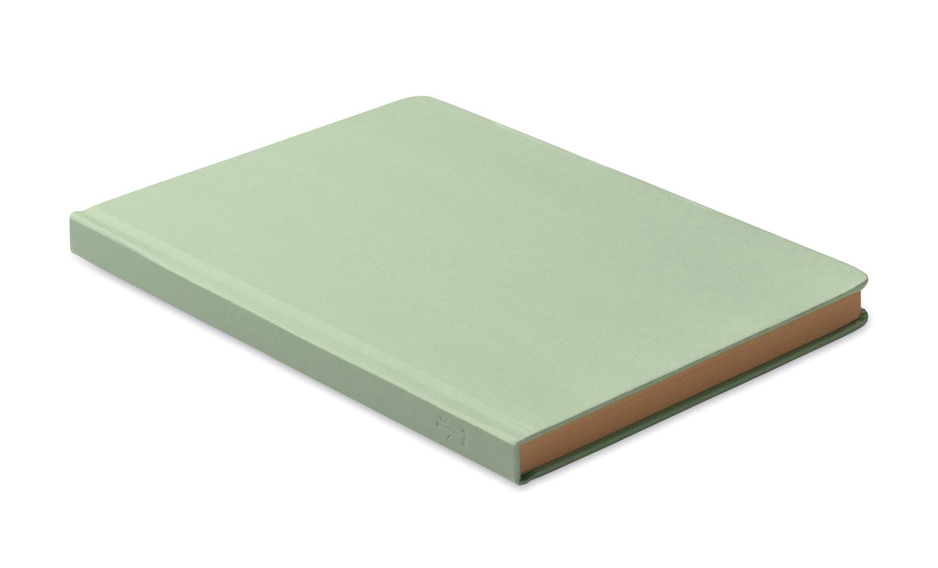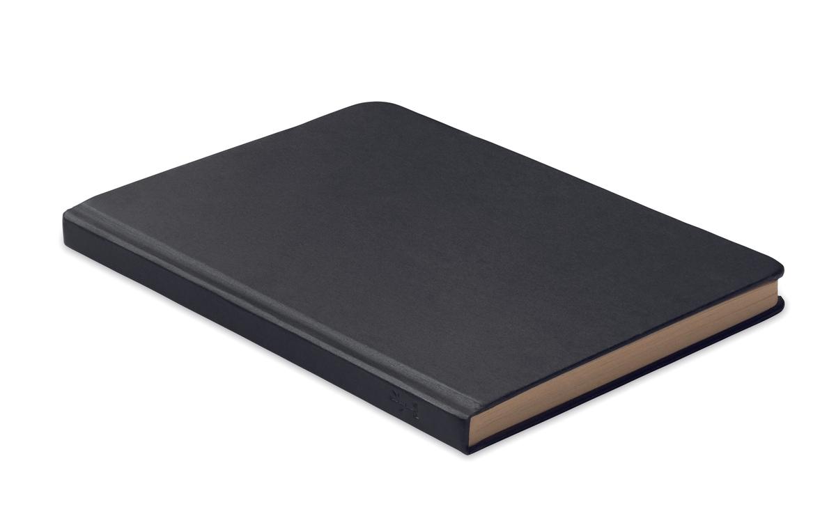 Carnet A5 avec couverture rigide et 160 pages lignées (80 feuilles) en PLA canne à sucre (65% fibre de canne à sucre/35% papier). Reliure dos collé.