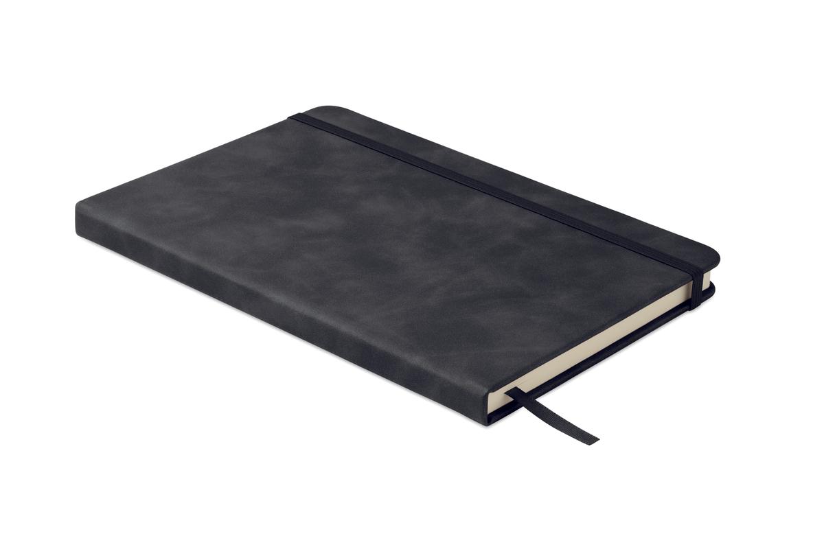 Carnet A5 avec couverture rigide en polyuréthane effet patiné recyclé à 40% et couverture en polyuréthane à 60%. Reliure dos collé. 160 pages lignées, papier recyclé 70 g/m² (80 feuilles). Elastique et Ruban marque pages assortie.