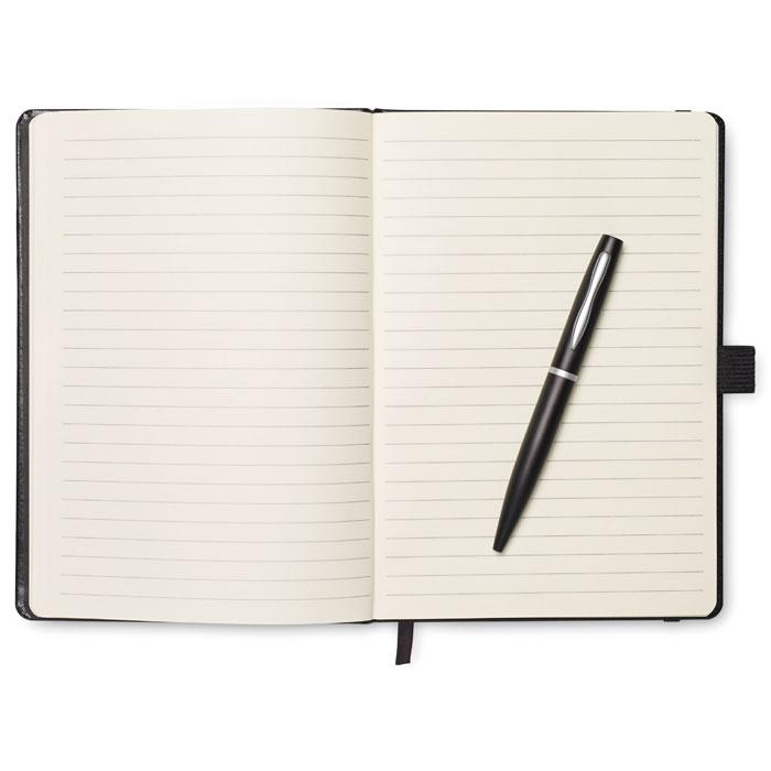 Carnet A5 avec stylo. Couverture rigide en PU. 144 pages lignées (72 feuilles). Bande élastique de fermeture et porte-stylo assortis. Stylo à bille à bouton-poussoir en métal assorti. Encre bleue.