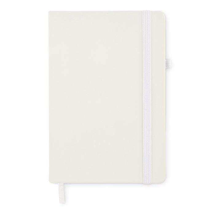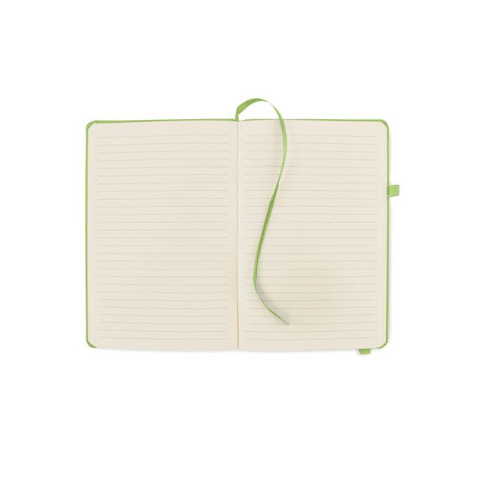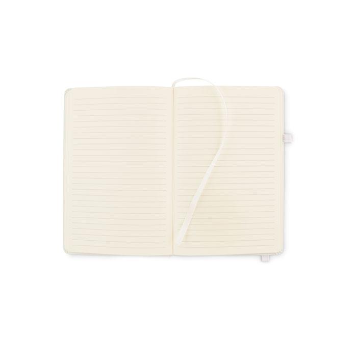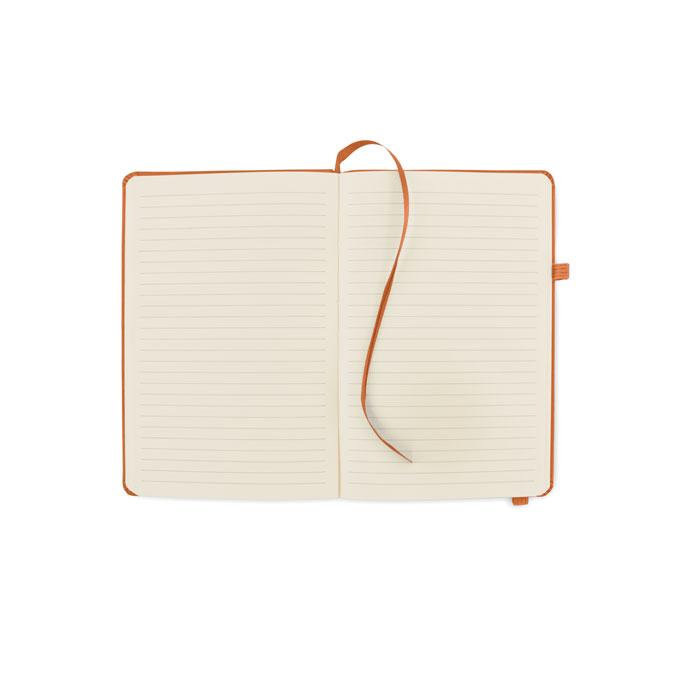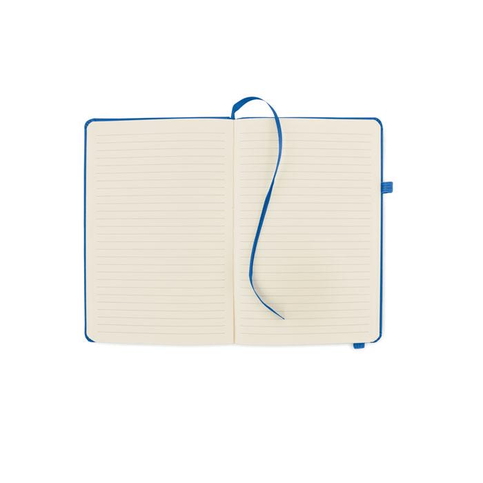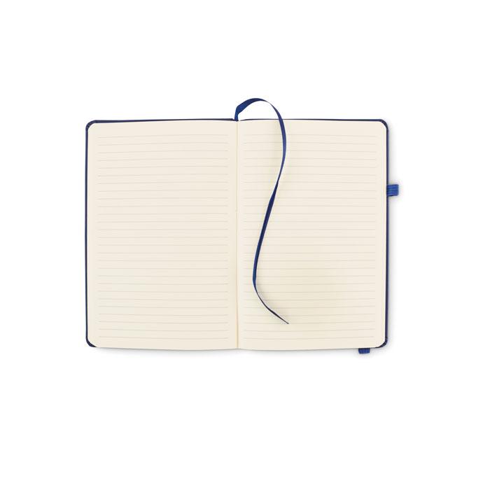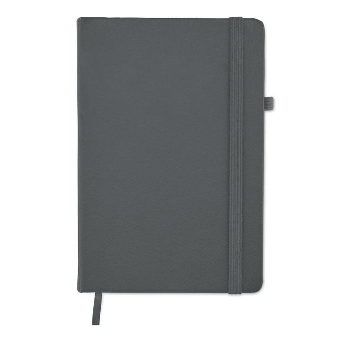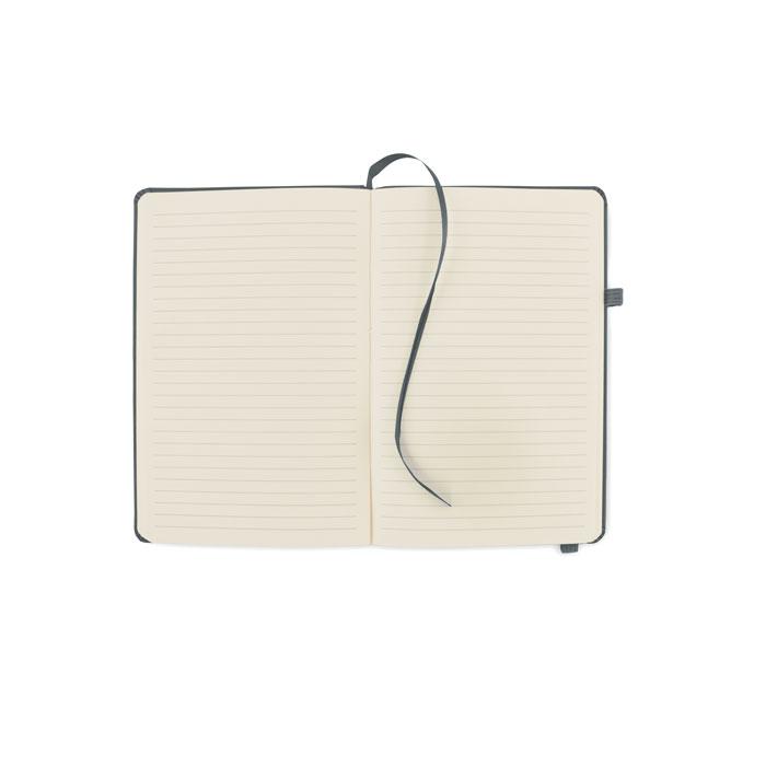 Carnet A5 avec couverture en cuir pré-consommation recyclé à 70 % et en latex PU à 30 %. 192 pages lignées en papier recyclé (96 feuilles). Fermeture élastique et porte-stylo assortis.