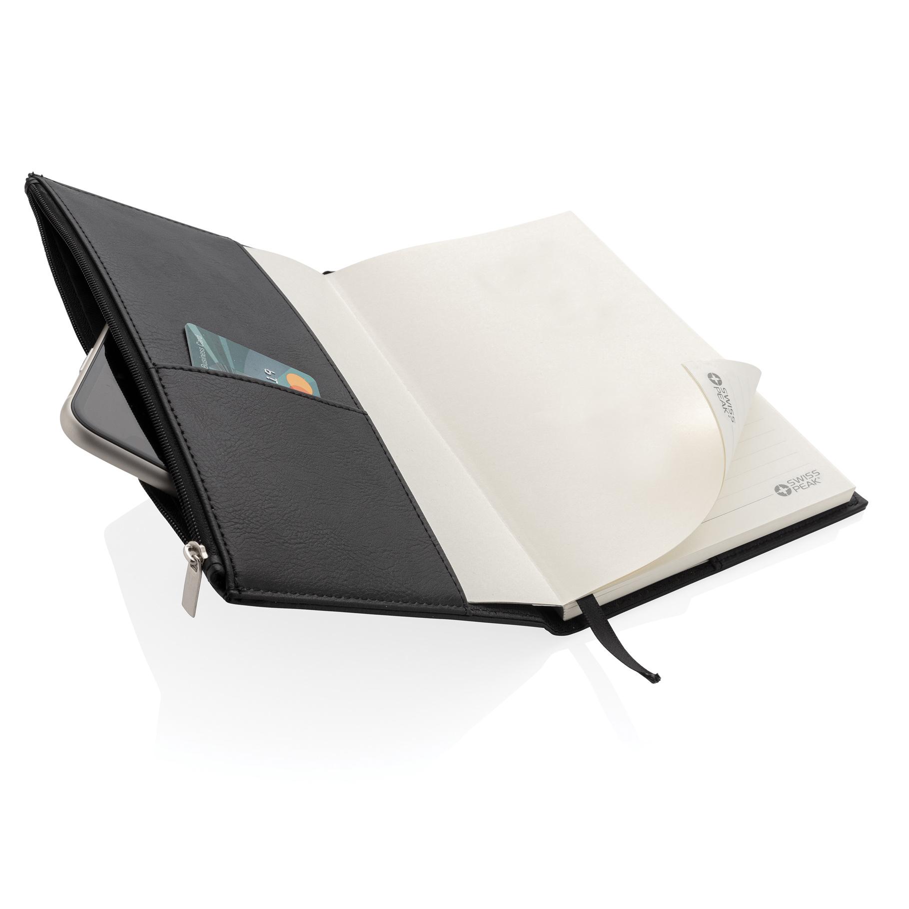 Carnet de notes A5 en PU avec 80 feuilles/160 pages de 80g/m²(papier crème). Grâce à sa poche frontale pratique à fermeture éclair, vous pouvez y ranger vos objets essentiels lors de vos déplacements. Livré dans une boîte cadeau de luxe.