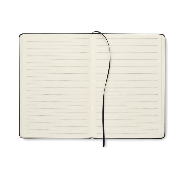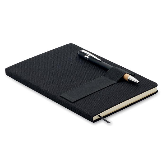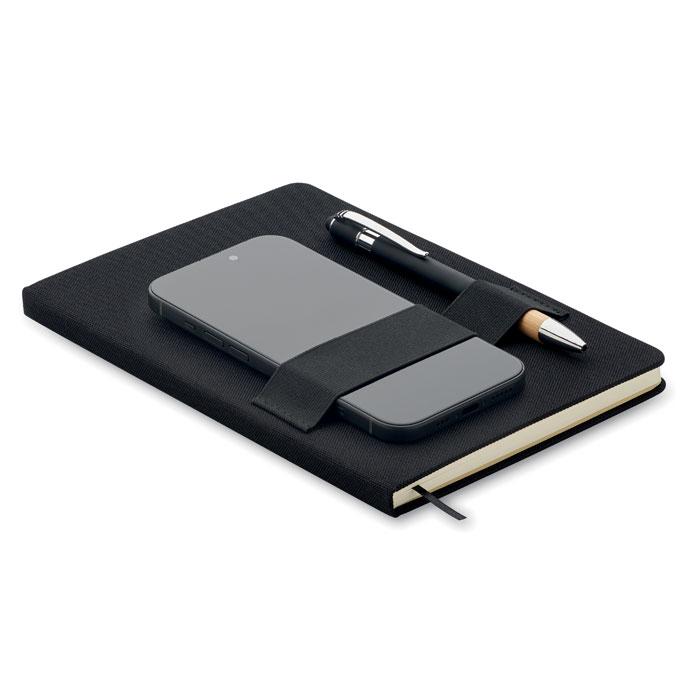 Carnet A5 en feutre RPET 600D à couverture rigide avec fonction support de téléphone et stylo à bille en bambou. Reliure dos collé. 160 pages lignées en papier recyclé (80 feuilles). Fermeture élastique. Marque-page en ruban. Encre bleue.