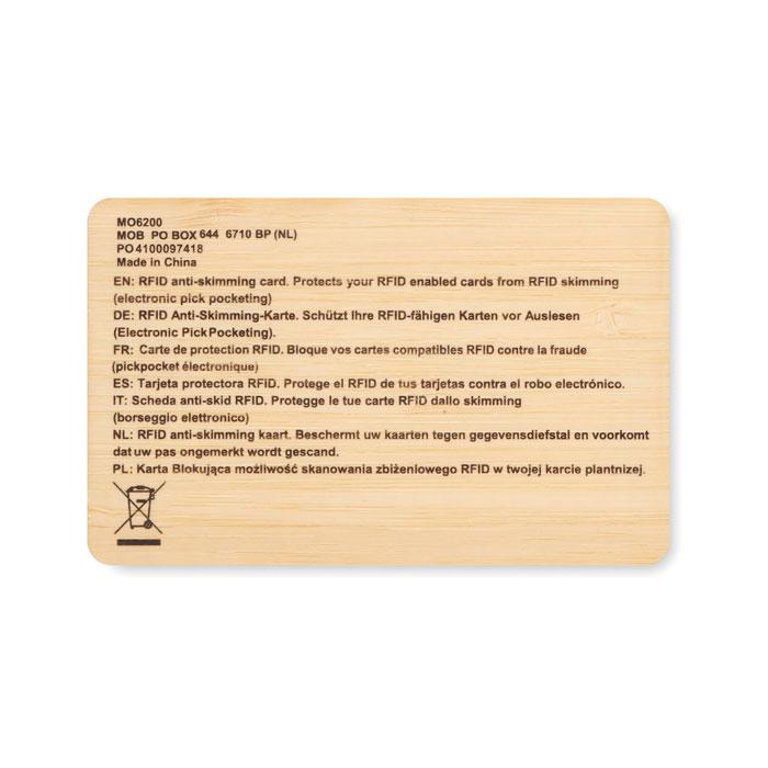 Carte RFID anti-écrémage en bambou. Grâce au champ électromagnétique, elle sécurise toutes les cartes 13,56 MHz contre le vol à la tire électronique sur une distance de 2 à 3 cm autour de la carte. (1,3 mm). Le bambou est un produit naturel, et présente de légères variations de couleur, de décoration et de tailles.