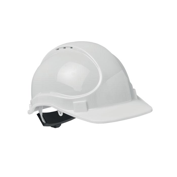 Casque de sécurité ajustable en ABS pour chantier et industrie. Équipé de ventilations, d'une jugulaire amovible et d'un bandeau anti-transpiration. Tour de tête réglable (51-63cm). EN397.