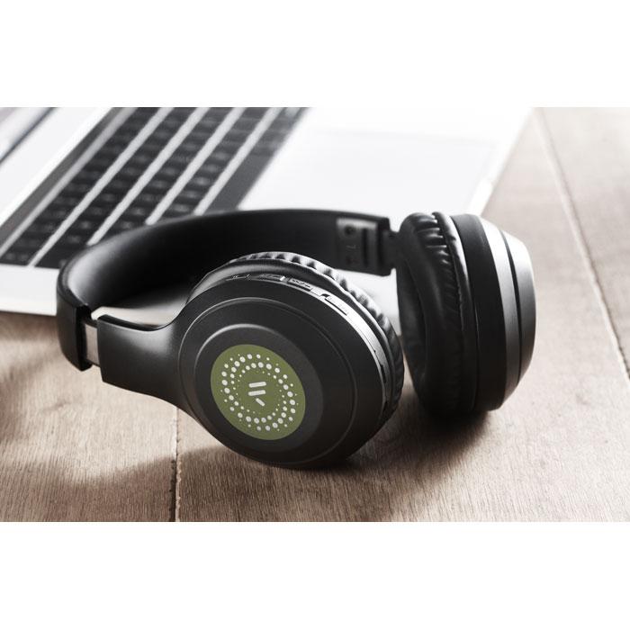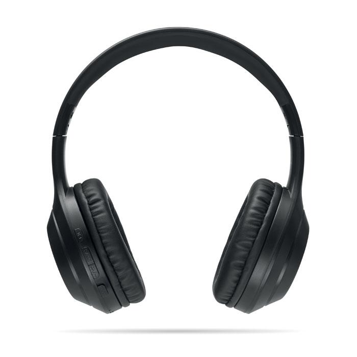 Casque sans fil 5.0 pliable en ABS dans un sac à cordon en coton de 140 gr/m2. Batterie Li-Pol rechargeable de 200 mAh. Fonction mains libres et microphone intégrés. Durée de lecture d'environ 4 h. Câble de chargement micro USB. Portée de fonctionnement : 10 m.