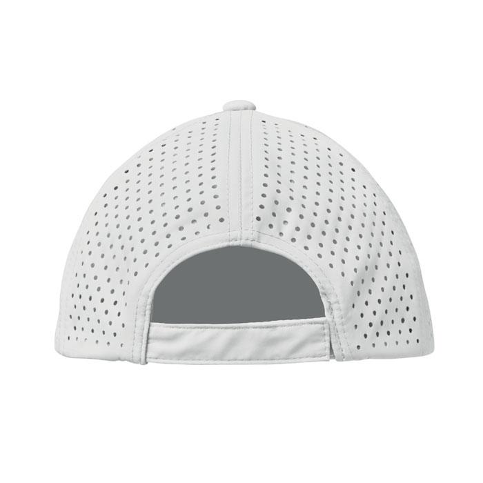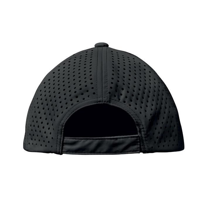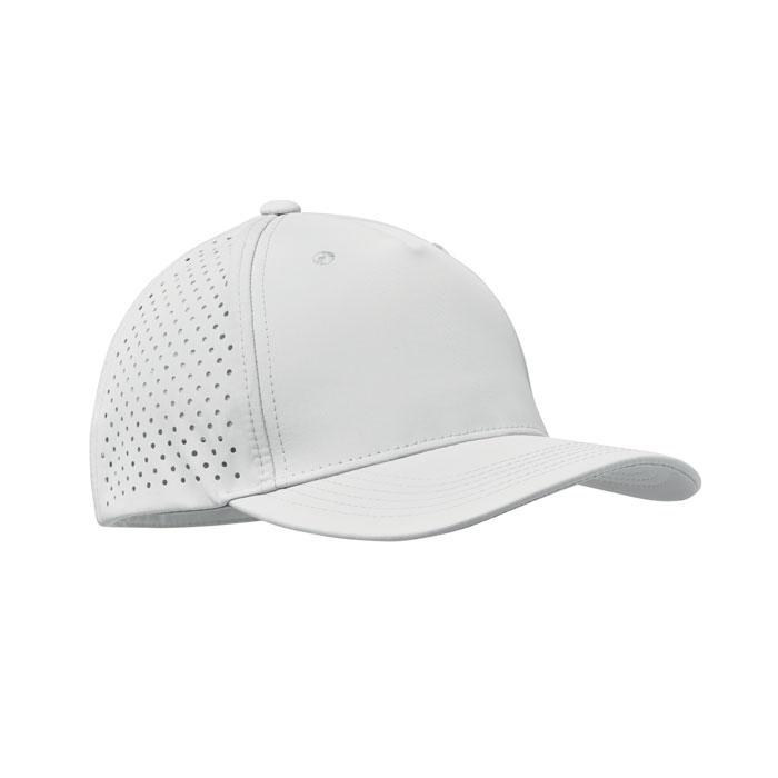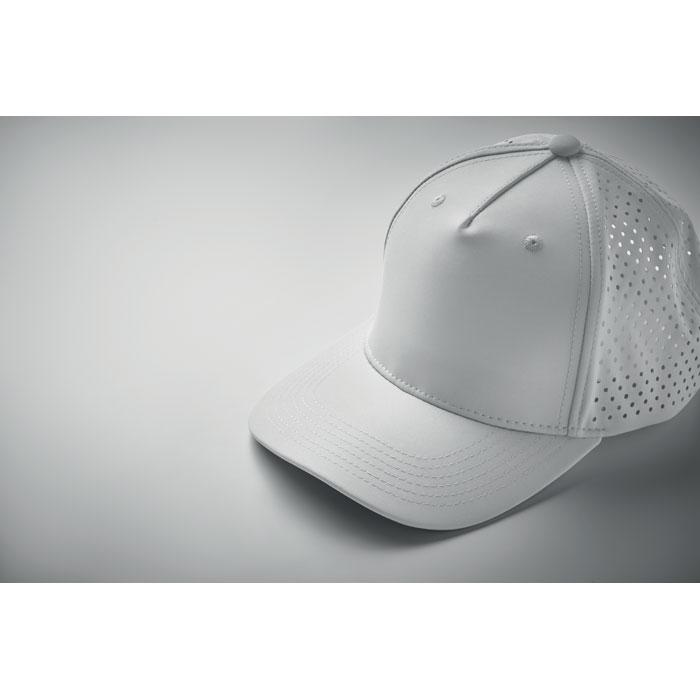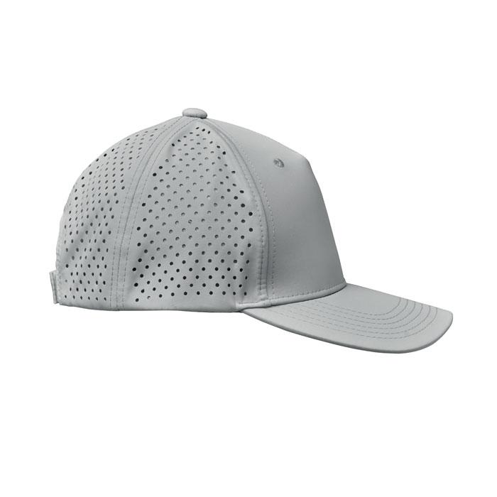 Casquette en polyester 5 panneaux avec fermeture auto-agrippante réglable. 4 panneaux perforés. Panneau avant avec 2 œillets cousus de couleur assortie. L'article sèche rapidement et est déperlant. 130 gr/m²