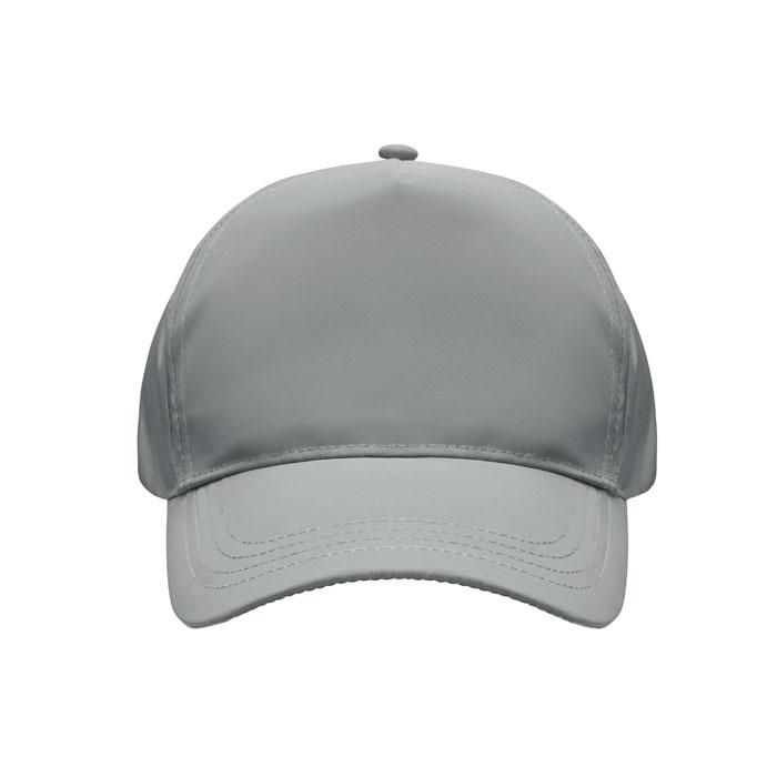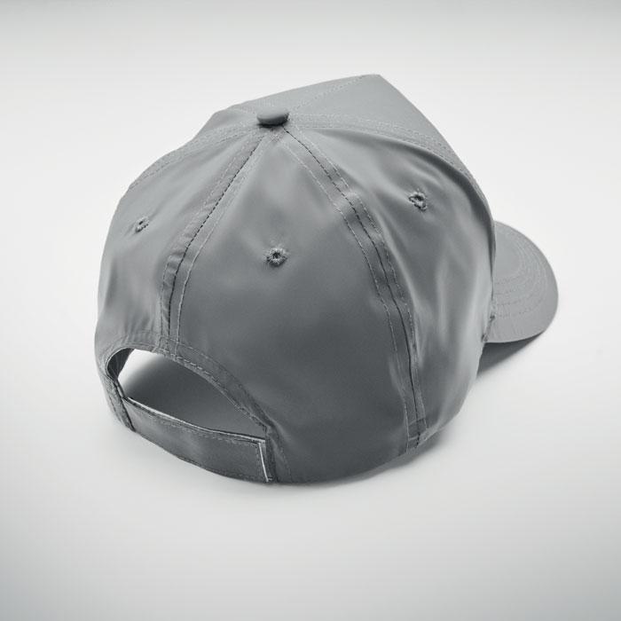 Casquette de baseball à 5 pans en polyester 190T réfléchissant. 4 œillets cousus avec fermeture auto-agrippante. Taille 7 1/4.