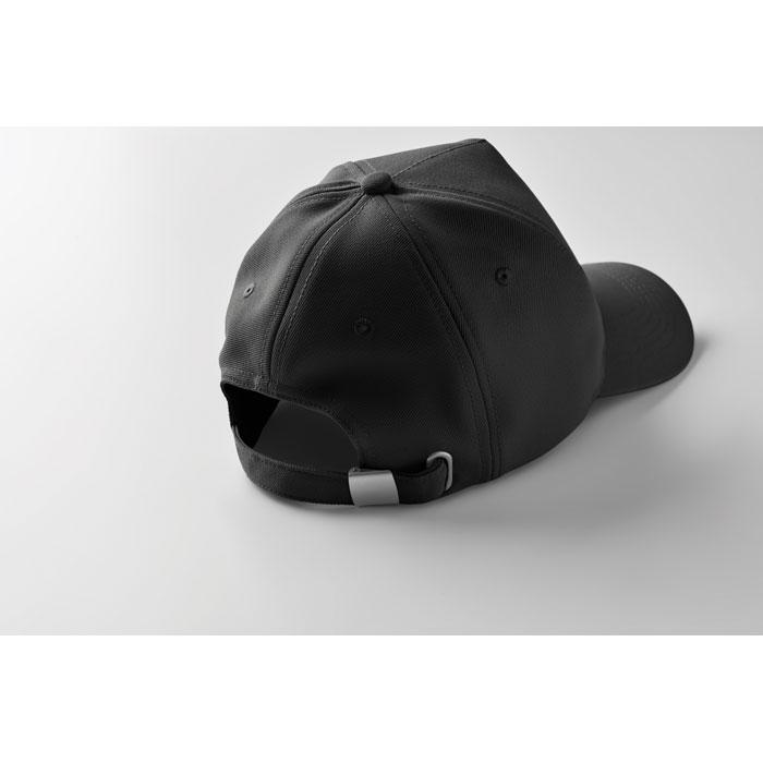 Casquette de baseball à 5 pans en polyester Rpet 210 gr/m² avec boucle en acier argenté. 4 œillets brodés de couleur assortie. Taille 7 1/4.